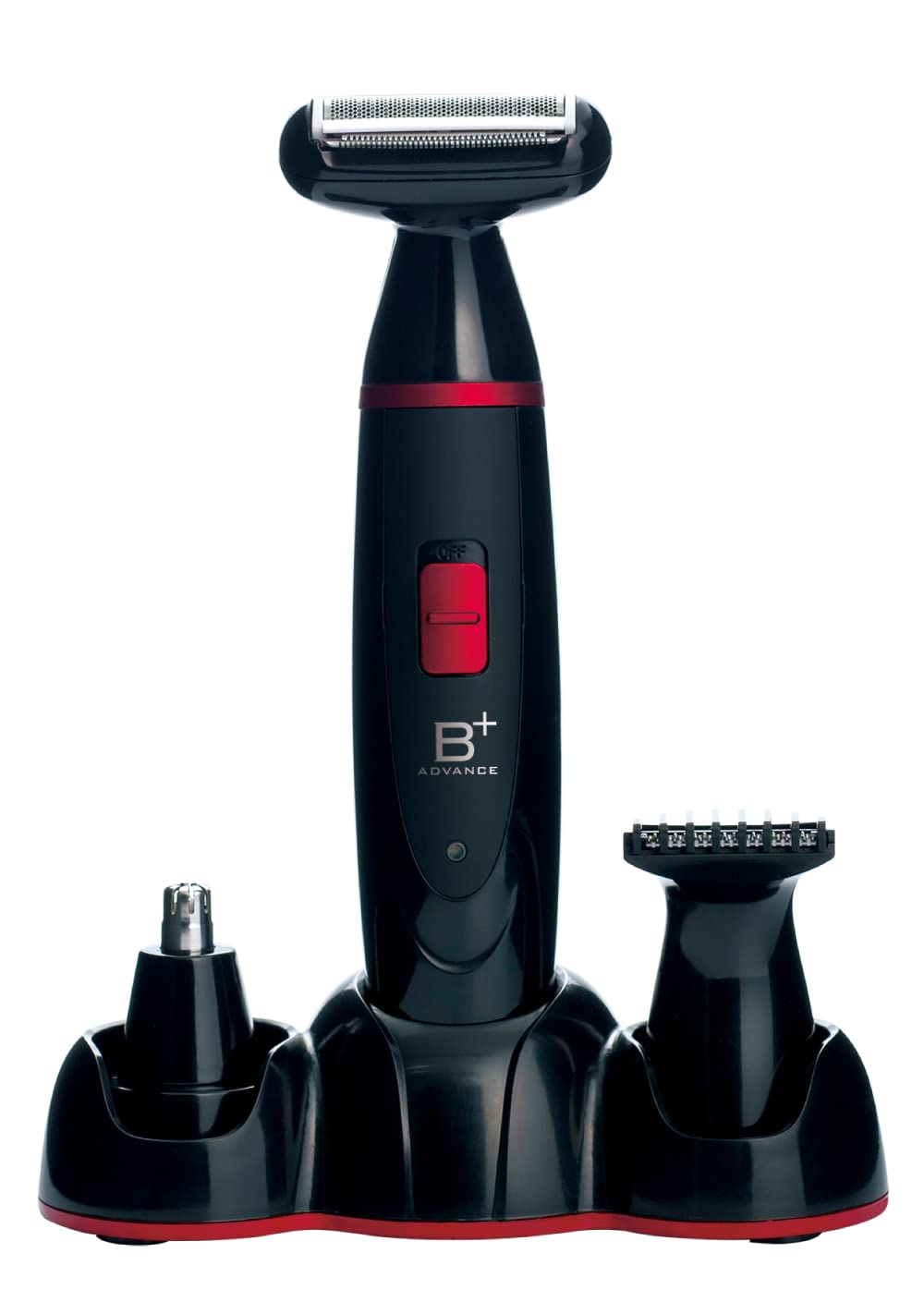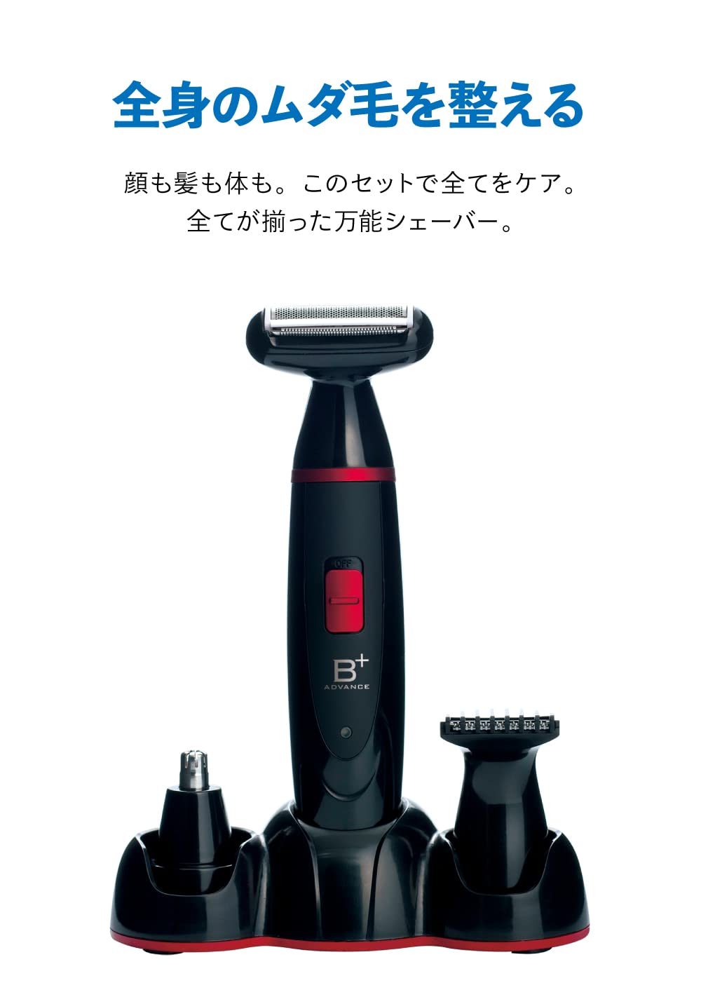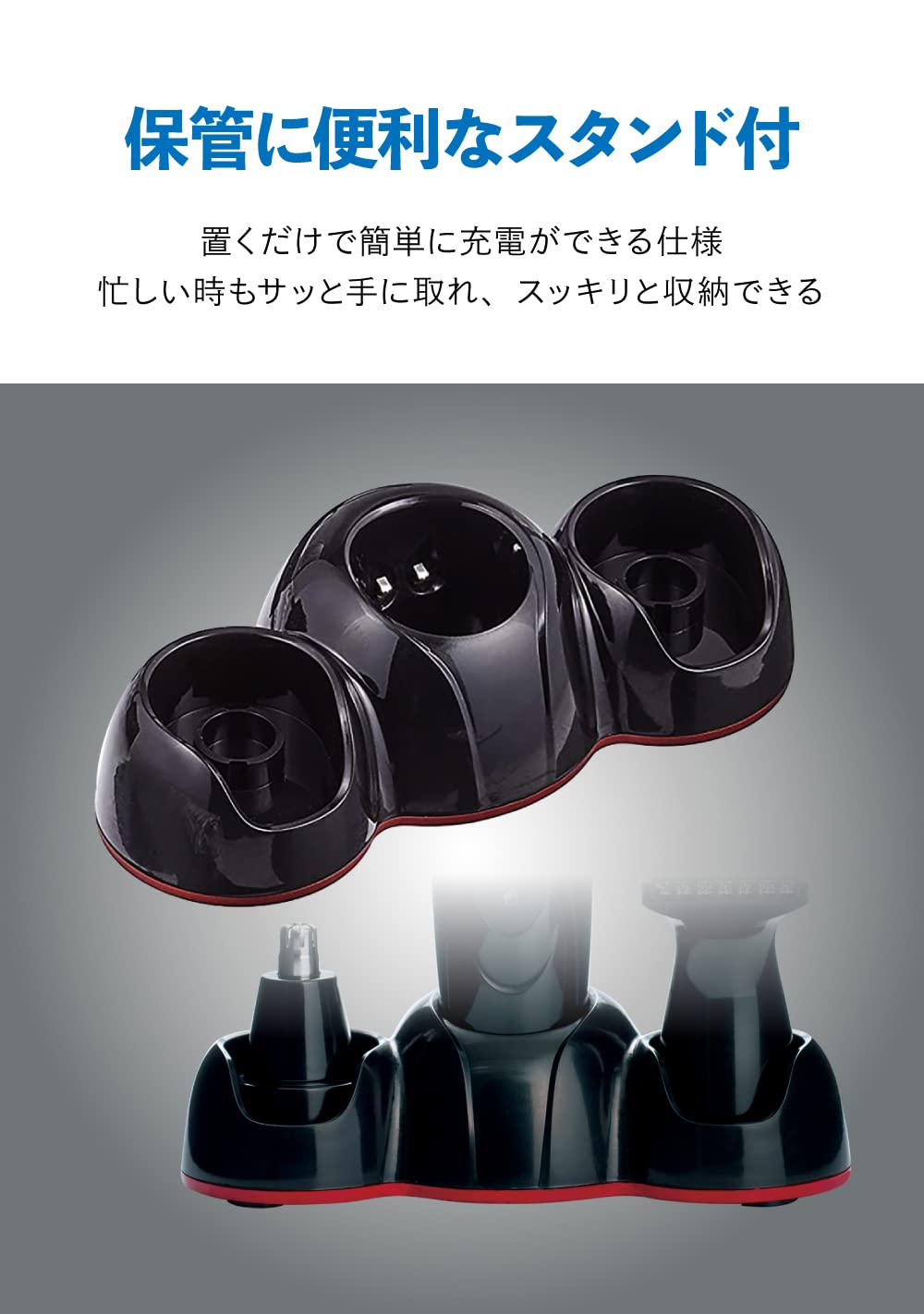 【3in1、たったコレだけ顔?全身簡単ムダ毛処理】充電ボディグルーミングキット。腕/脚/胸毛/ワキなど全身に使えるボディシェーバー、髭/眉毛/えり足/モミアゲなど細部の処理できるミニトリマー、鼻毛/耳のお手入れができるノーズトリマーがセットになった3in1仕様。収納に困らない便利なスタンド付き。