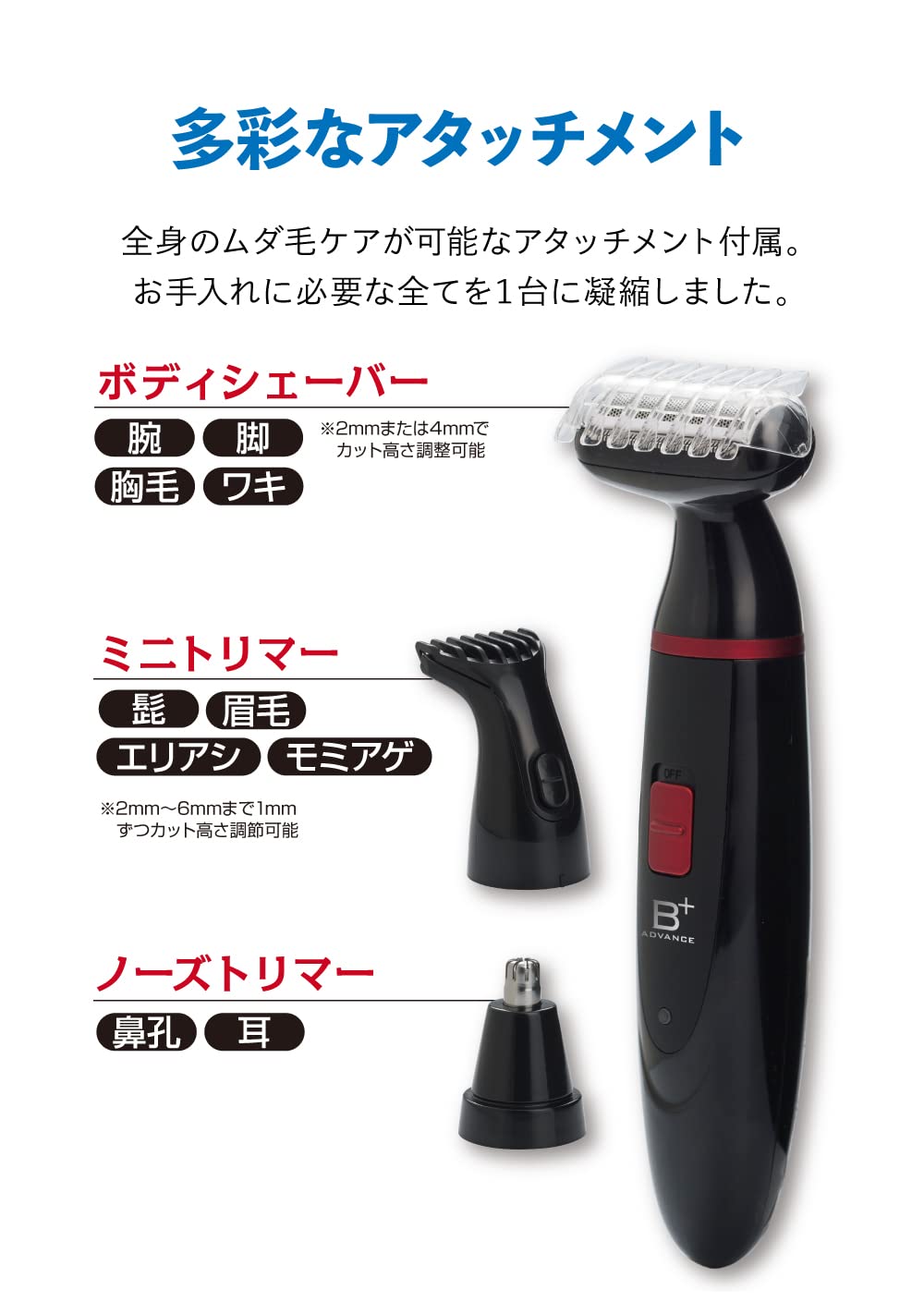 【異なる刃のW構造で触っていたくなるスベスベ肌が完成】網刃の前後のトリマーで長い毛をしっかりキャッチしてカット、更に短くなった毛を中央の網刃でしっかりと剃れるのでスムーズに処理することができます。先端のアタッチメントを付け替えることで、眉毛も鼻毛も簡単に処理。ミニトリマーは高さ調節コームで2mm?6mmまでお好きな長さに調節することもできるので、剃りすぎの心配もいりません。ノーズトリマーは鼻孔を傷つけない形状で、見えない鼻の中も安心して鼻毛をカットできます。