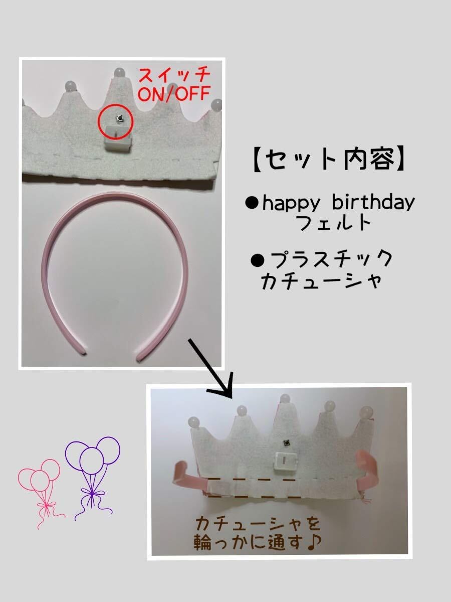 【商品詳細】●最高なバースデーの思い出に!!クラウンを付けるだけでbirthdayが盛り上がる事間違いなし?主役のインパクト大です。 ●サイズ:王冠 高さ11㎝・ヘッドバンド幅13㎝・クラウン高さ11㎝ 【使用方法】:HAPPY BIRTHDAY布の裏側に穴が開いており、そこにご自身でプラスチック輪っかを通してご使用いただきます。 ●光るLED付き。3パターンで点灯しボタンで点灯パターンをお選び頂けます。