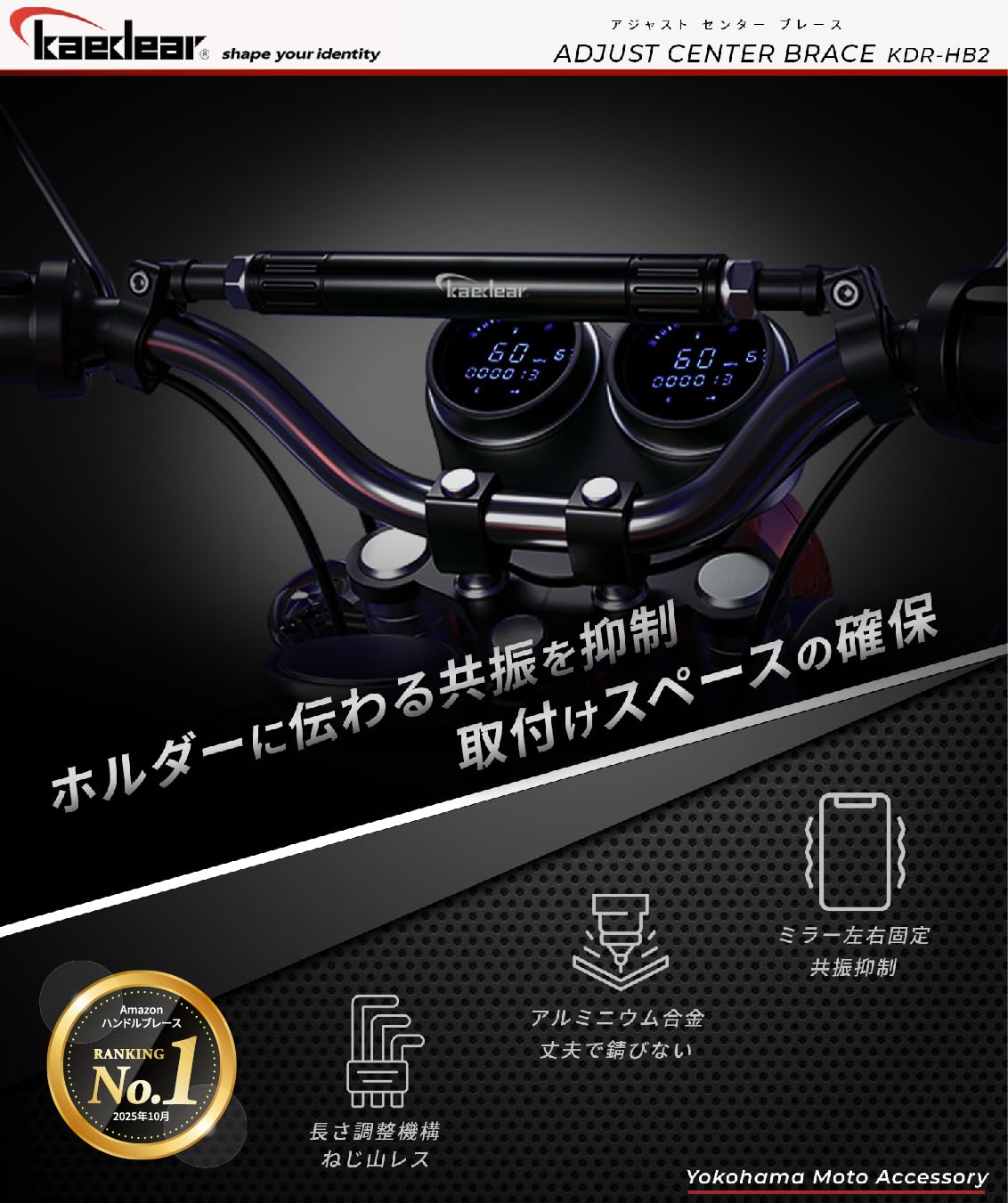 【調整式】 本来の剛性を高める上では六角ナット締め付けによるフィッティング構造での調整機構は望ましくありません。しかしニーズはドレスアップ要素と マウントパーツ の クランプバー として高まる中で、ねじ式は伸ばすとねじ山が見えてしまいルックスに問題があります。そこで Kaedear アジャストセンターブレース ではフィッティング構造を採用し、伸ばしてもスタイルが変わらない仕様としました。 22mm ブレースバー は中央に配置し、 ハンドルブレース を伸ばしても ホルダー 類を ハンドル 中央に寄せて マウント できます。