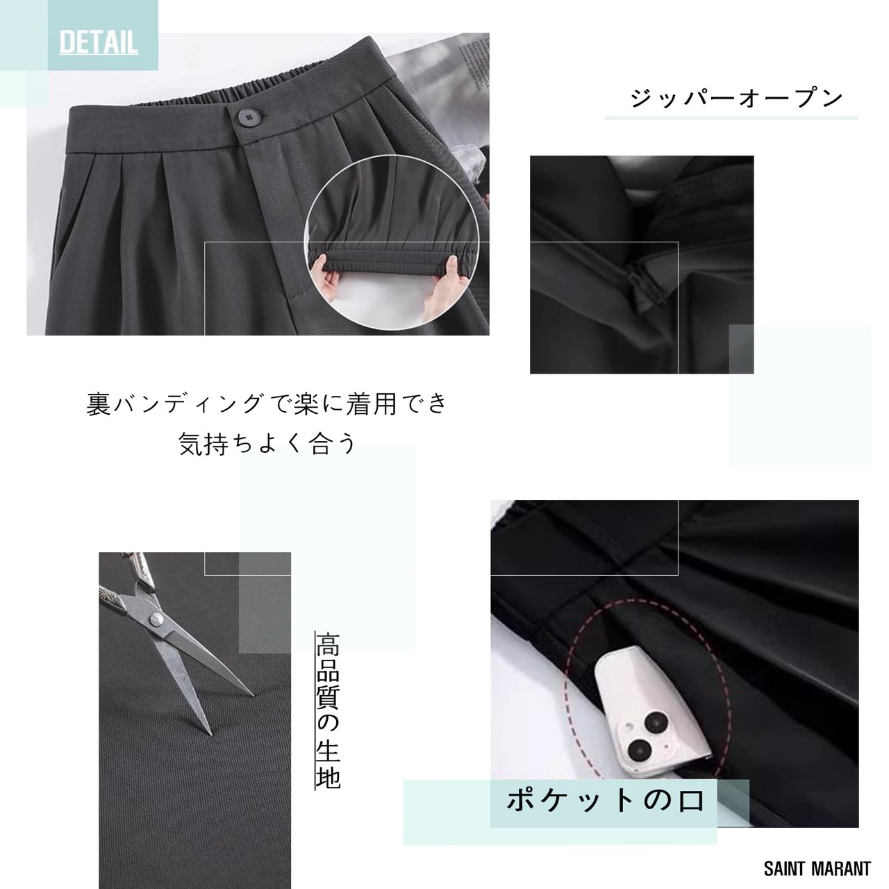 ファッション デザイン: 足を長く見せるハイウエストタイプ。ウエストと伸縮性のあるパンツはファスナーで快適な着心地を実現しました。