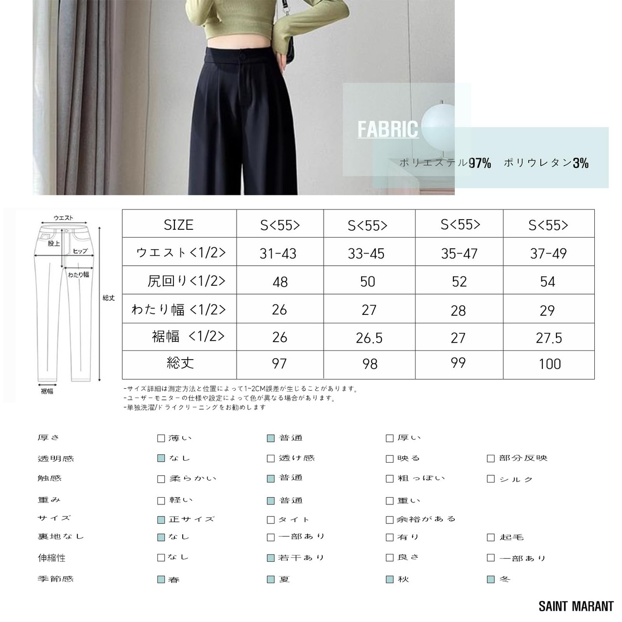 【特価】[SAINT MARANT] SL2401レディース ウエストゴム 美脚 タック ワイド パンツ ハイウエスト 黒 ロング スラックス パンツ スーツ オフィス カジュアル ズボン