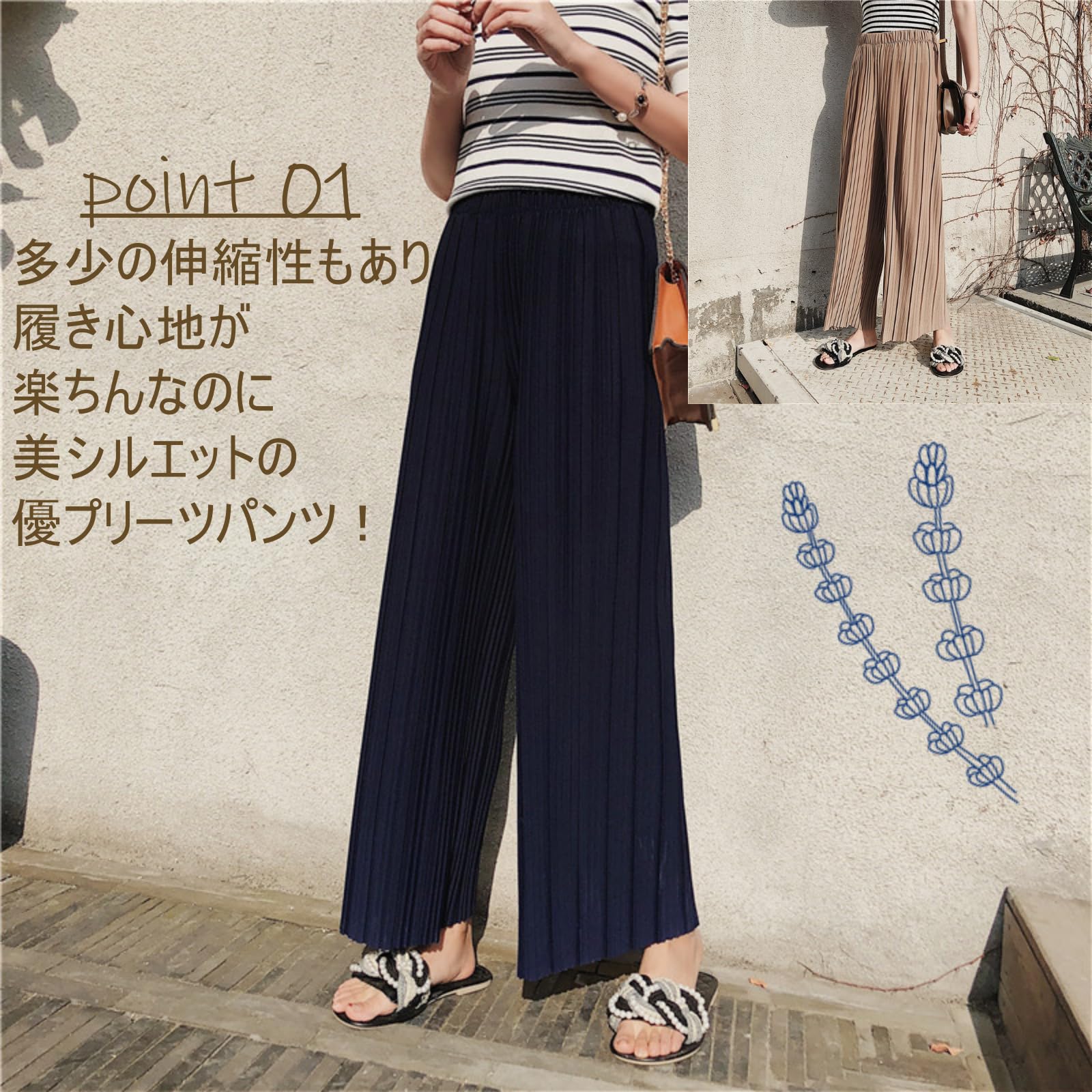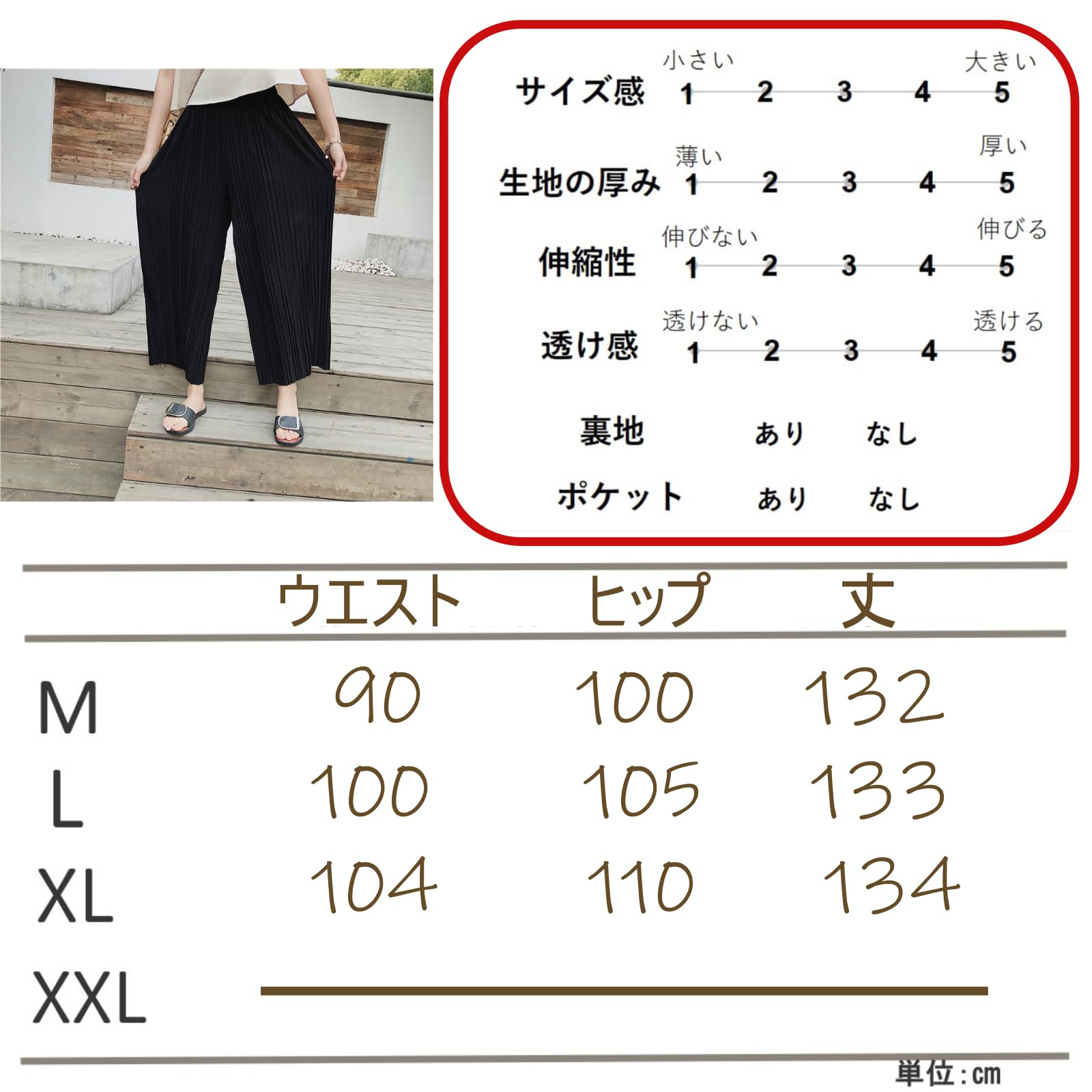 ●プリーツデザインで美脚&体型カバー 縦ラインを強調する細かいプリーツデザインが、脚をすっきり長く見せる美脚効果を発揮。無地のシンプルさとプリーツの表情が組み合わさることで、上品さとカジュアルさを兼ね備えた大人のパンツスタイルが完成します。どんなトップスとも相性が良く、コーディネートに悩みません。