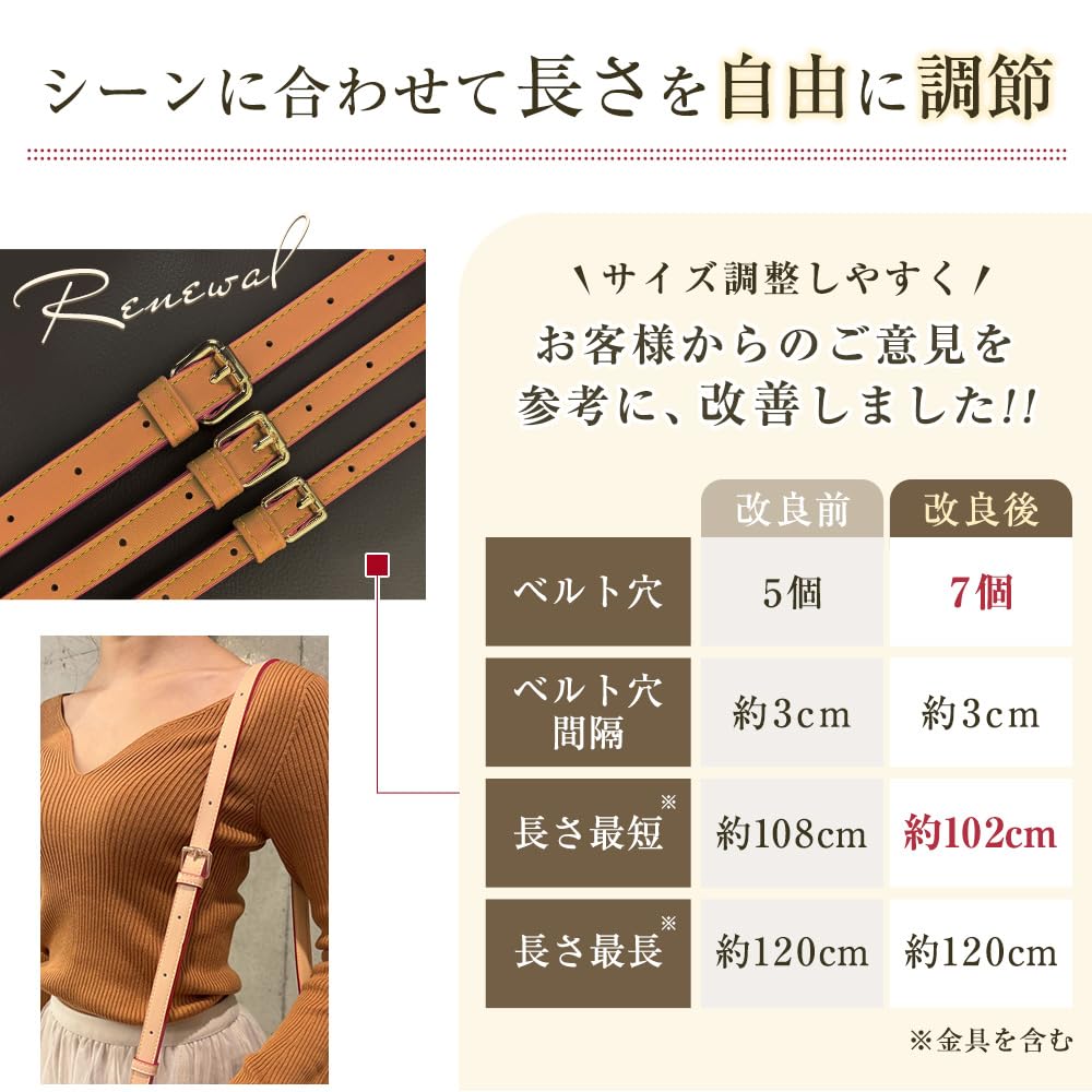 ?【長さ調節機能付き&選べる金具カラー】〈長さ調節機能付き〉ベルトの長さは約102cmから120cmまで調整可能で、身長や用途に応じて最適なフィット感に調節できます。肩掛けやクロスボディスタイル(斜め掛け)など、好みに合わせたスタイルで使用可能です。ブラックカラーのショルダーベルトは、金具のカラーを「ゴールド」または「シルバー」から選択可能。