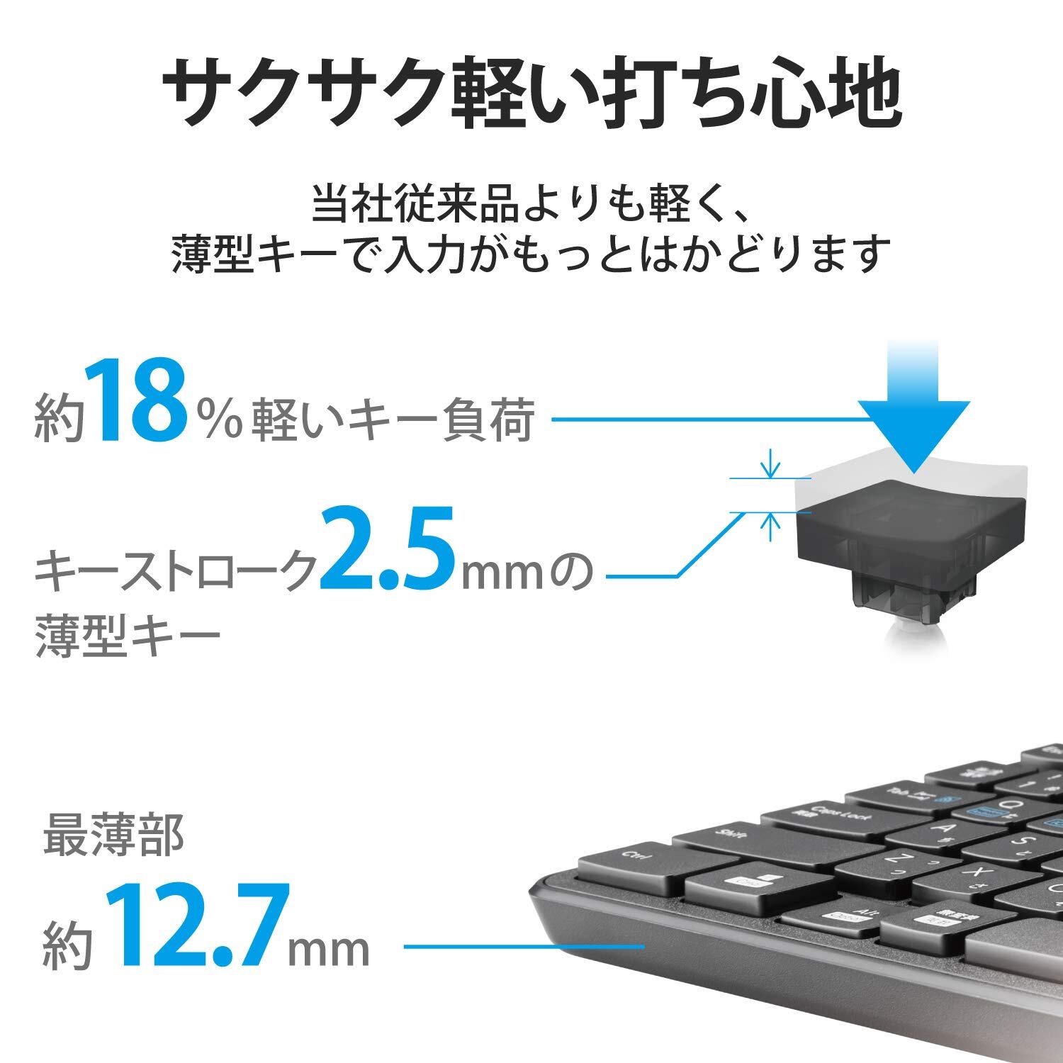 サクサクと軽い打ち心地を実現したキー設計を採用した薄型キーボードです。