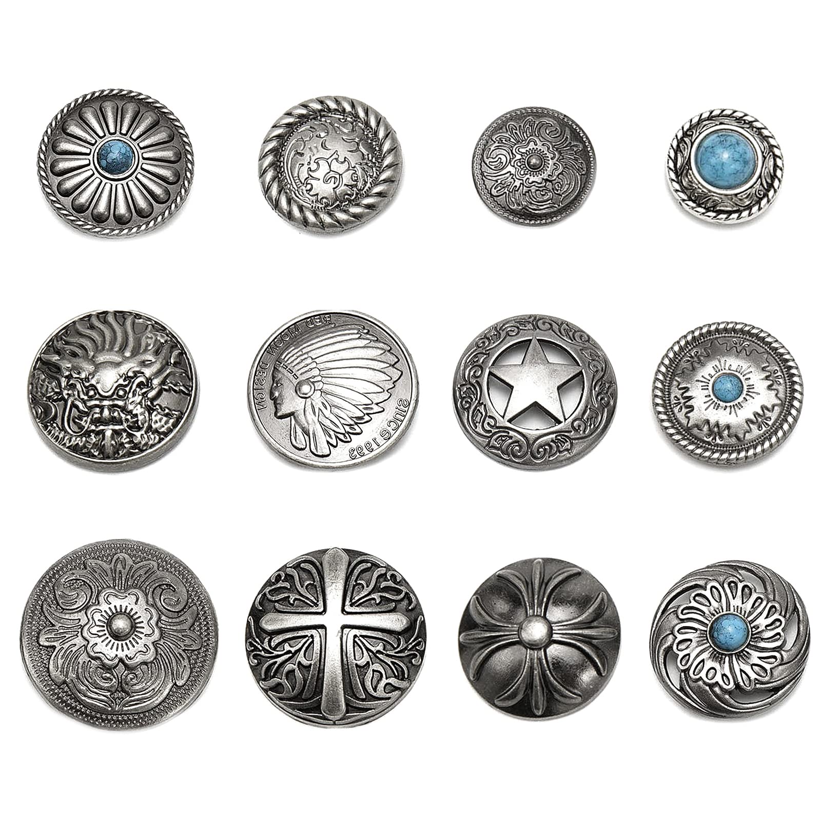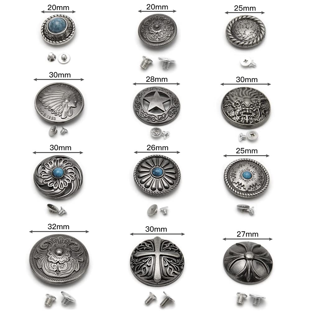 サムコス 12個セット コンチョ ボタン 20mm〜32mm ねじ式 インディアン 十字架 ターコイズ 唐草 龍 五芒星 クラフト レザークラフト バッグ 財布 手芸 DIY 裁縫 飾りボタン 交換 取付簡単