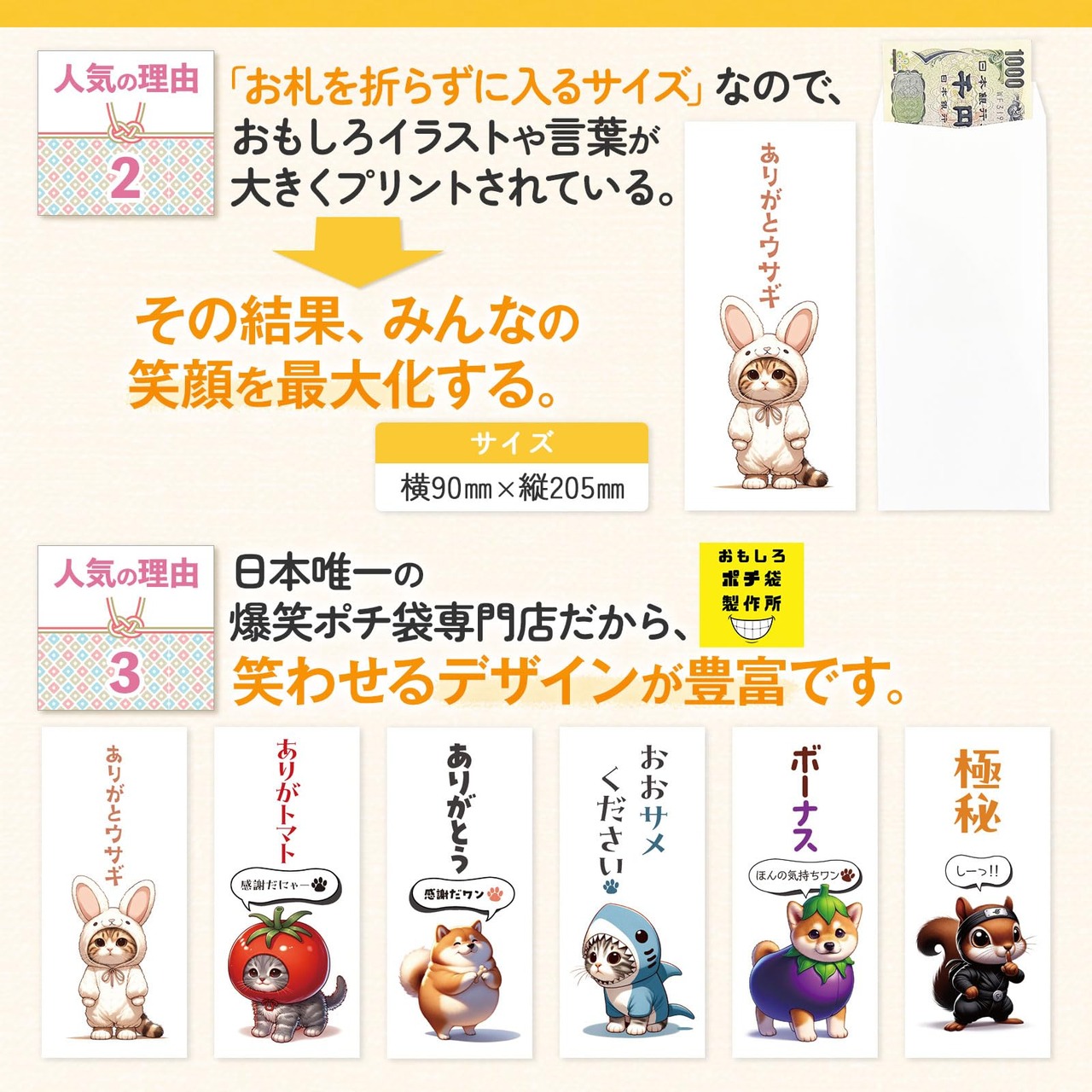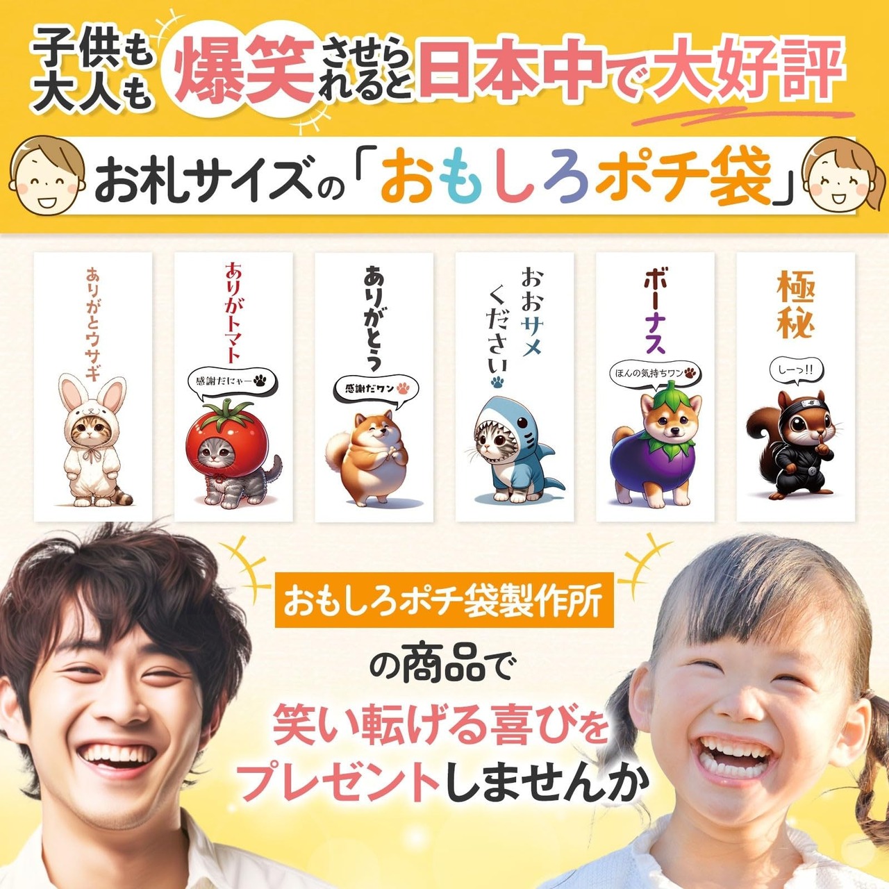 おもしろポチ袋は、お年玉袋・お小遣い袋・お祝い袋・ご祝儀袋・給料袋・月謝袋・お礼封筒・お車代・心付け・お返しなど、さまざまな場面で活躍します。子どもから大人まで、幅広くお使いいただけます。