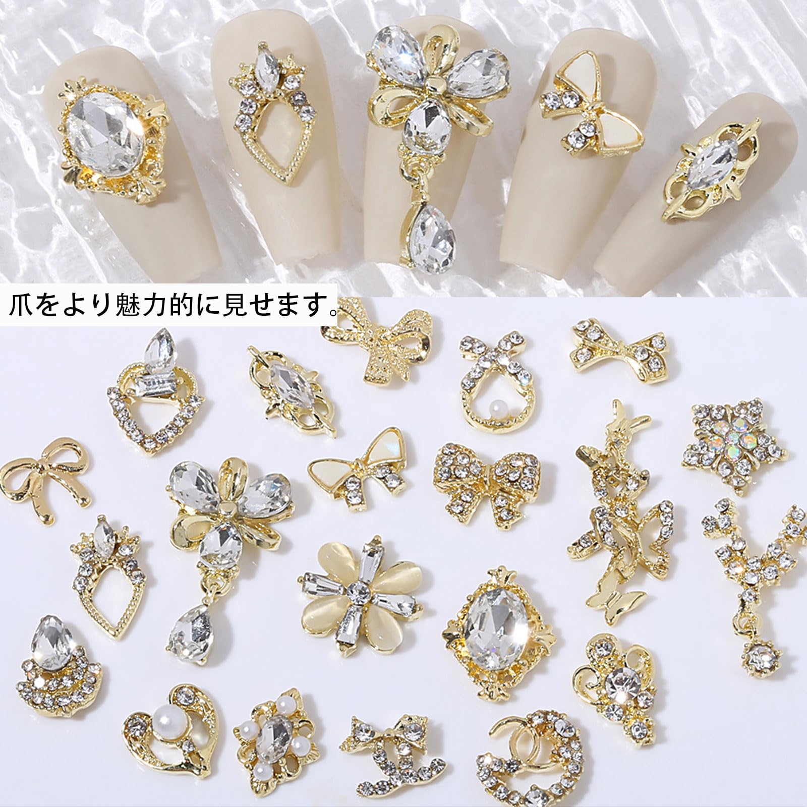 【ネイルパーツ】リボン、ハート、花、蝶などさまざまなスタイルのネイルパーツが揃っています。キラキラしていて、ネイルのワンポイントにぴったりです。 【素材】高品質の合金とラインストーン素材を採用したネイルパーツは高級感があって美しい輝きを放ちます。軽量で、使いやすく、耐久性もあります。 【DIYネイルアート】大きめタイプなので、立体効果があり、ネイルを美しく飾ることができます。エレガントで上品なネイルを作りたい時に欠かせない。 【幅広い用途】ネイルのアクセントに最適です。アクセサリー製作、スマホケースや服装の装飾、ハンドメイド作品のデコレーションなどにもご使用できます。 【パッケージ】ネイルパーツ24個セット。