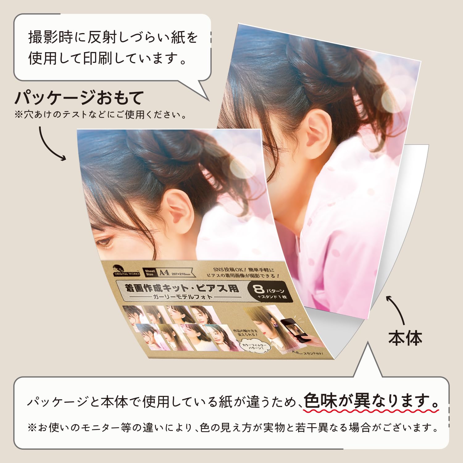 モデルフォトを使えば、アクセサリーのサイズ感がわかる!実際のモデルさんに頼んだり、自撮りをしなくてもモデルフォトを使うことで簡単に本物のような画像が撮影出来る。