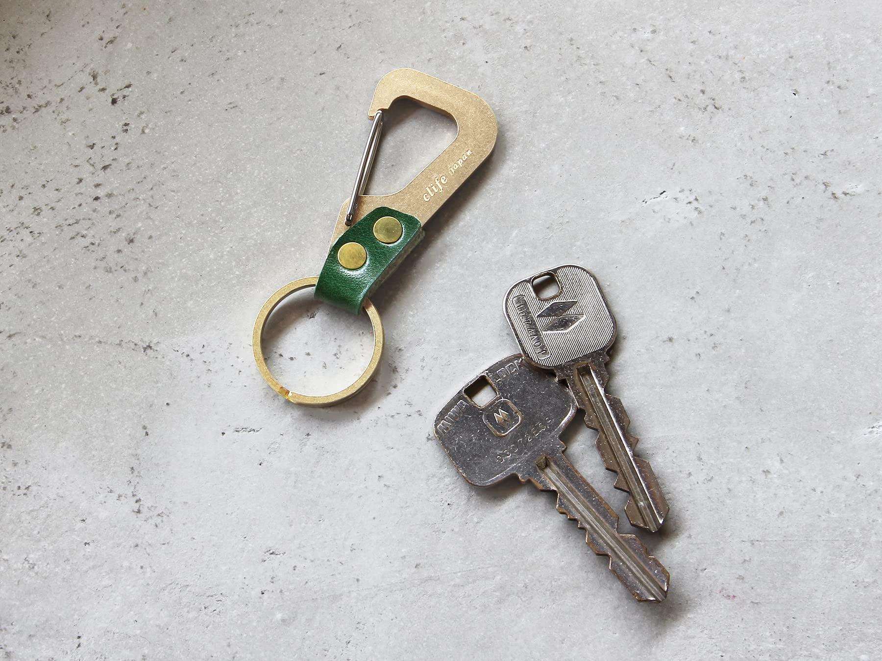 シンプルで使い易いカラビナキーホルダー。真鍮無垢のカラビナと二重リングをフルベジタブルタンニンなめしレザーで繋げた他には無い特徴的なシルエット。