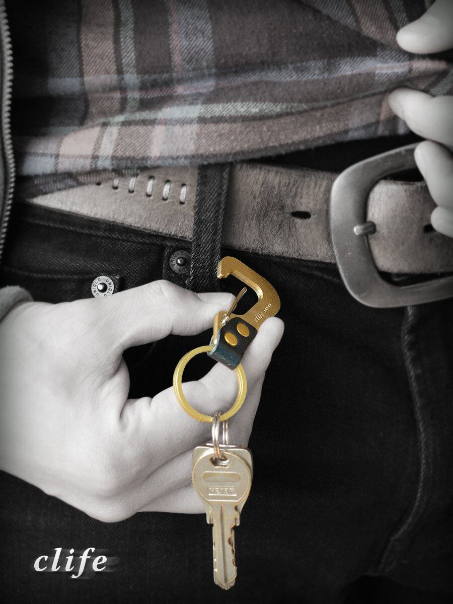 大阪のファクトリーブランドclife【クリフ】の第3弾アイテム。3mmもの厚みのある真鍮をくり抜いて作られたナス管とベジタブルタンニンなめしの本革を組合わせたキーリングー。迫力のある、重厚な真鍮と本革の組み合わせが最高に格好良いアイテムです。