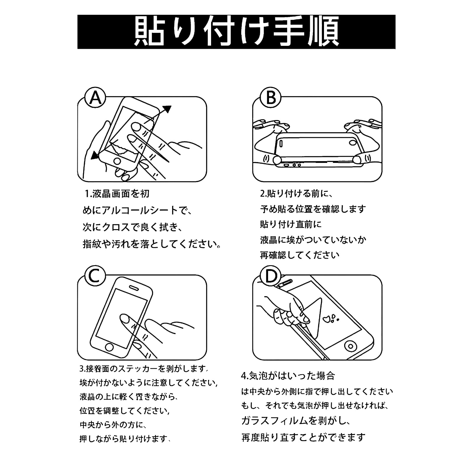 【気泡無しと簡単貼り付け】丁寧に加工したので、気泡が入りにくくて、4つ簡単な手順のみで誰でも簡単に貼り付けることができます。自己吸着できるシリコン粘着シートで、簡単的に貼り付けます。ガラスを液晶に置くだけで自然に吸着、簡単に気泡が抜いて行くので、誰でも簡単、綺麗に貼ることができます。