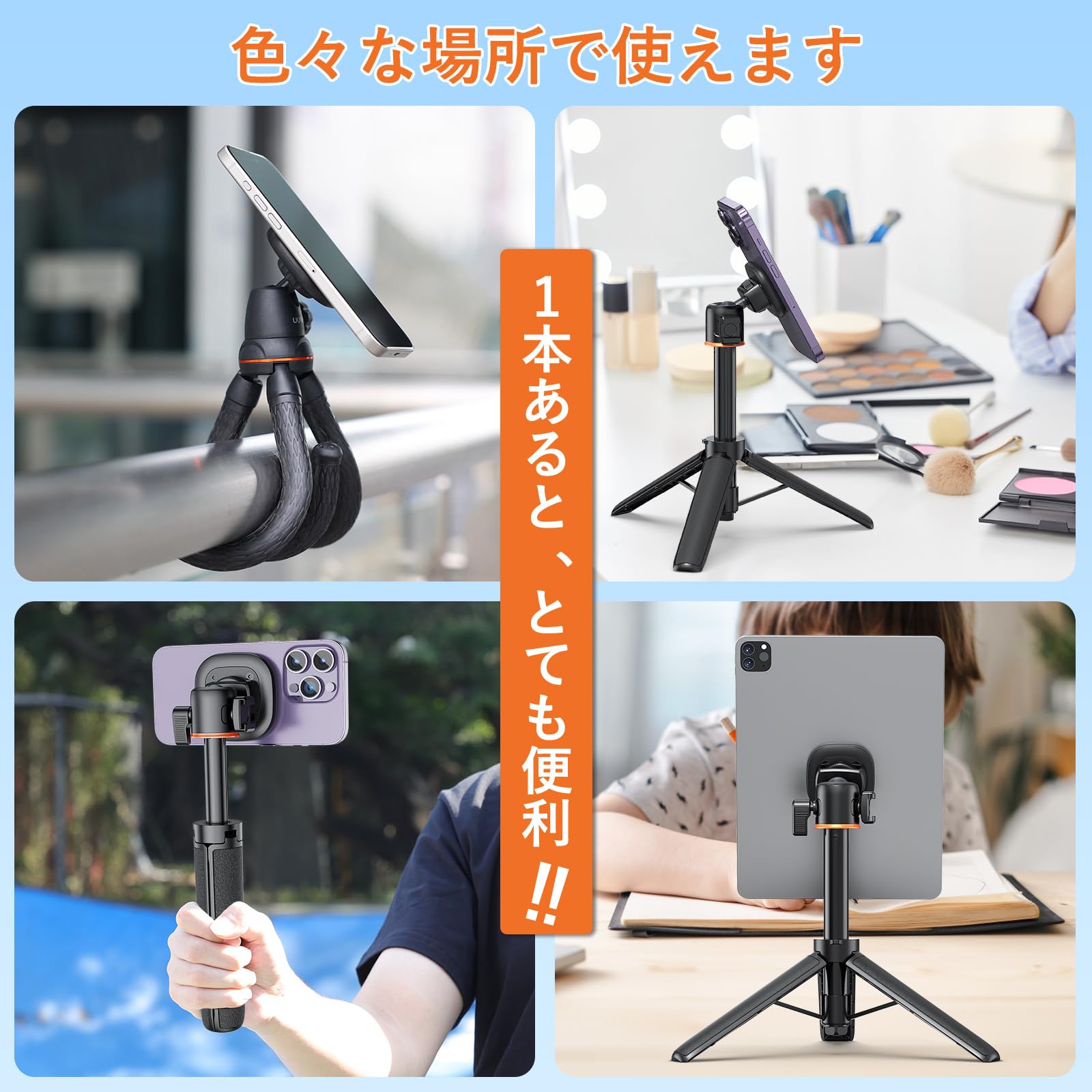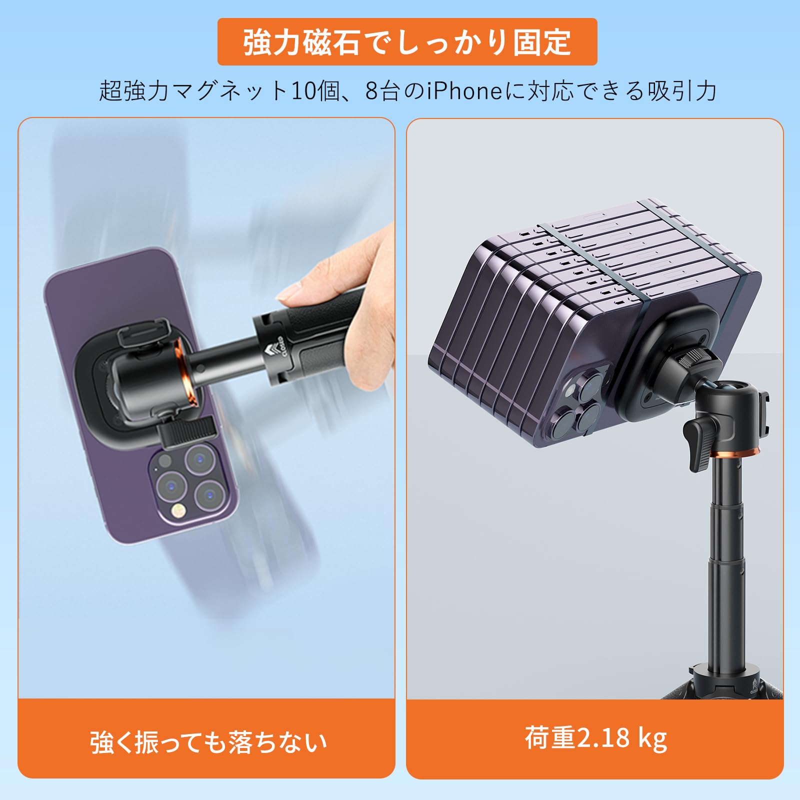 ??【超強力マグネット】マグネットは5個のスマホもラクラク持ち上げられる程、超強力ハイパワーな磁力があるので、落とす心配もありません。また、パッドが剥がれないようにマグネットの構造にもこだわっています。中は強力な接着材、外側はアルミ合金でしっかり覆うことによって剥がれを防止して、iPhoneがずり落ちたりする可能性はほぼありません。また、携帯電話を自由に回転させ、角度を調整することができます。??注:三脚は含まれていません。