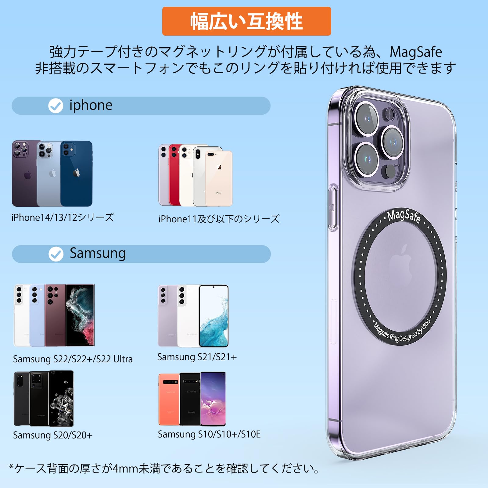 ??【すべての携帯電話に適用】全機種に対応。iPhone12以降の機種はスマホの裏側にマグネットが内蔵されているので、そのまま装着可能です。それ以外のMagsafe非対応のスマホは付属のメタルリングをご利用ください。