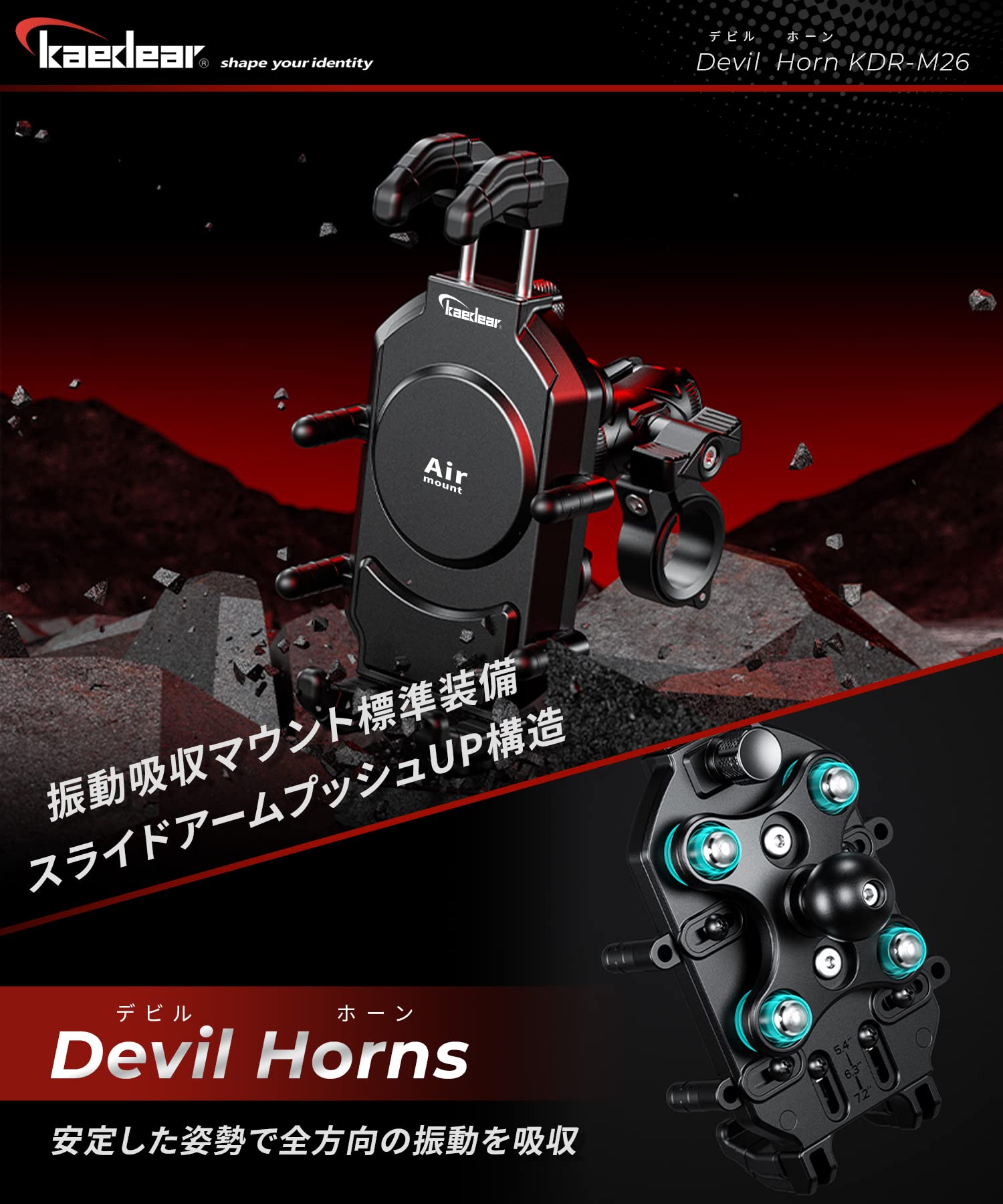 Kaedear(カエディア) バイク スマホホルダー 携帯ホルダー バイク用 振動吸収 マウント Airマウント 一体型, デビルホーン/Air Mount KDR-M26C (スマホホルダー)