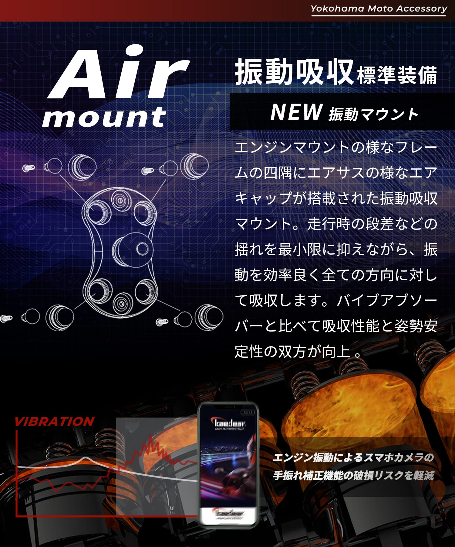 【デビルホーン】 上下の悪魔の角が大きく厚みがあるスマートフォンをしっかり固定します。アッパーアームをスマホで押し上げてスマホの脱着が可能です。両脇のガイドアームは中央を狙いやすく、横ずれ防止にもなります。スマホ機種のサイドボタンの位置に合わせたロアアームの高さ調整が可能です。走行中の衝撃でアームが開かないように裏のダイヤルでアームの固定ができます。標準装備の〔Airマウント〕はエアサスの様なエアーキャップがホルダーをフロートさせ、エンジン振動による高周波を効率よく吸収し、スマホカメラの手振れ補正機能の破損リスクを軽減します。別体のバイブアブソーバーを超える振動軽減効果を発揮しながら、段差などのギャップに対して姿勢の安定性が向上しています。「19mmの厚さに対応したホルダーを探していた」「Airマウント搭載が良い」「深いアームの方が安心感がある」、そんな方にオススメなモデルKDR-M26Cです。