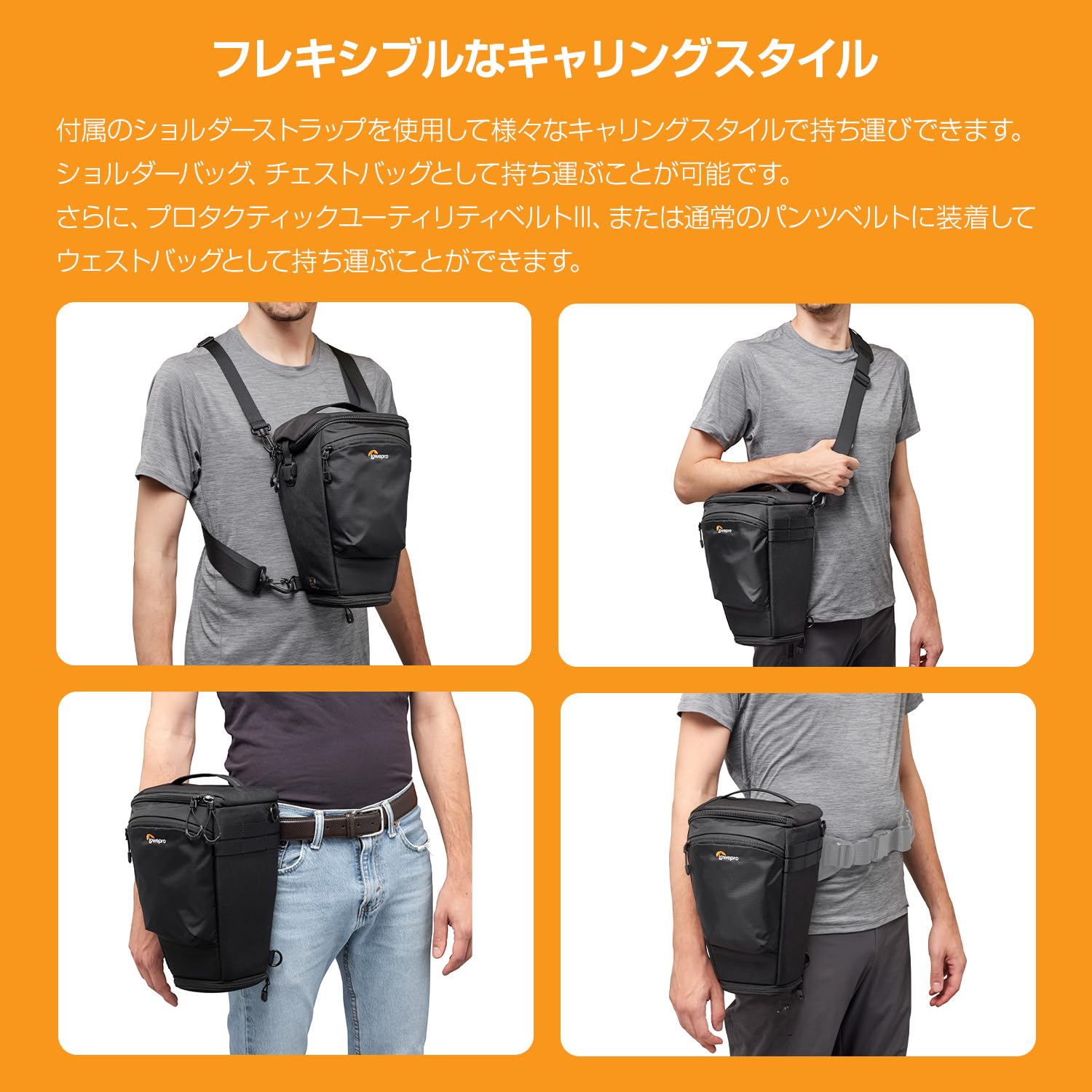 ショルダーストラップの使い方によって、さまざまなキャリングスタイルで持ち運びできます。