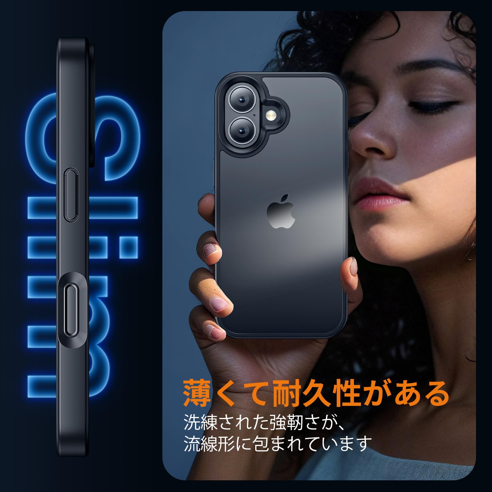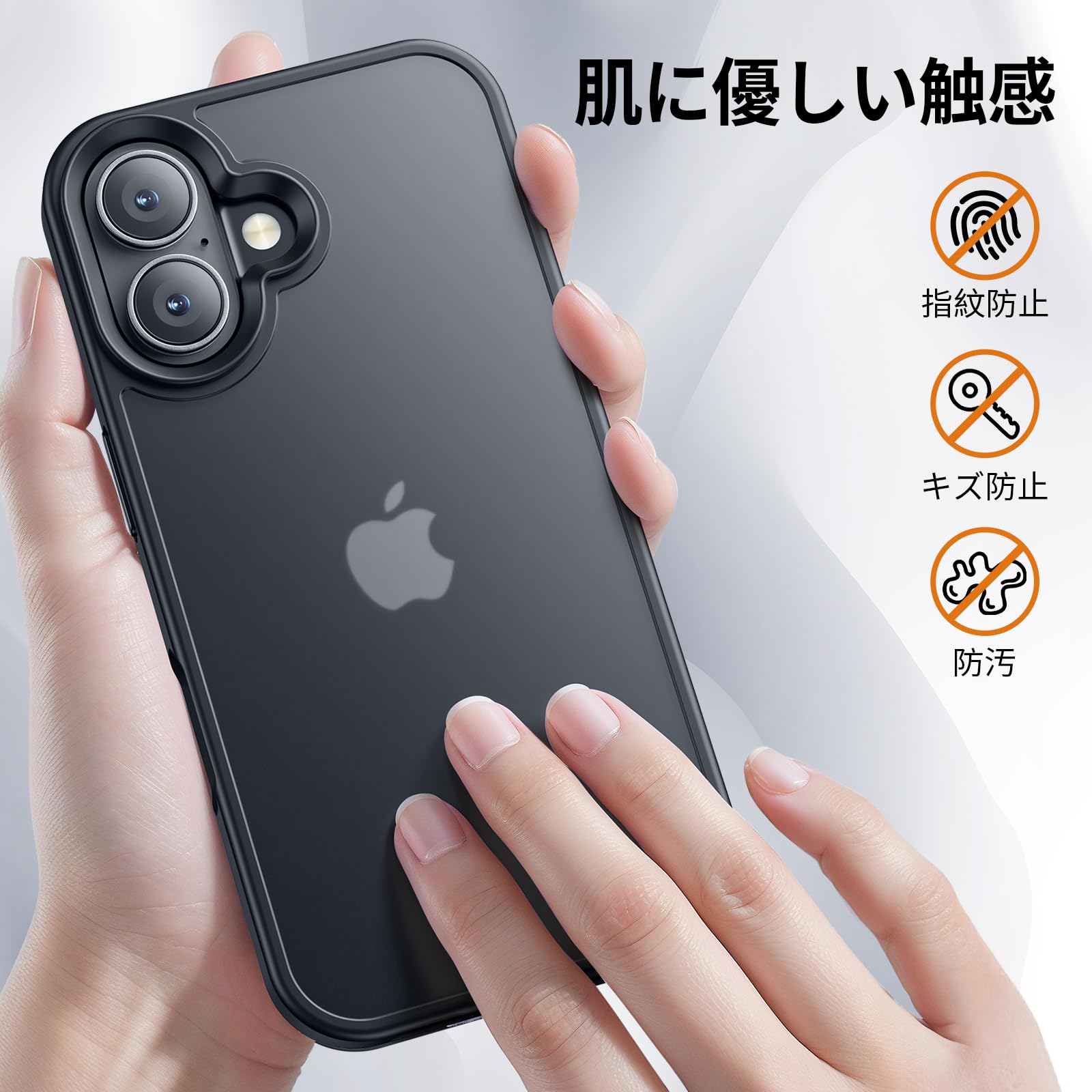 iPhone 16 用 ケース 半透明 衝撃吸収 米軍MIL規格取得 マット感 黄ばみなし レンズ全面保護 耐衝撃ストラップホール付き 6.1インチ アイフォン 16 用カバーラネ マットブラック