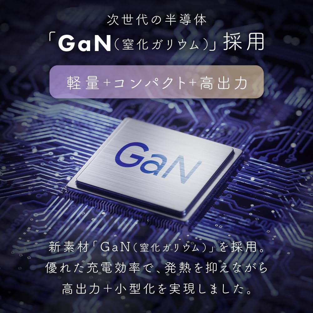軽量+コンパクト+高出力 次世代の半導体「GaN(窒化ガリウム)」採用:新素材「GaN(窒化ガリウム)」を採用。 優れた充電効率で、発熱を抑えながら高出力+小型化を実現しました。