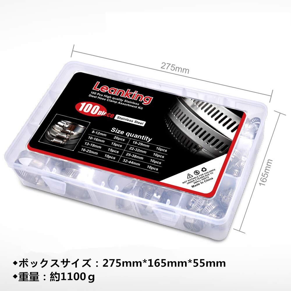 leanking ホースバンド ホースクランプ 100個入り 8サイズあり φ8〜44mm対応 調整可能 304ステンレス製 ねじタイプ 強力オールステンレス 手締め用 固定用 配管用 ホース締め金