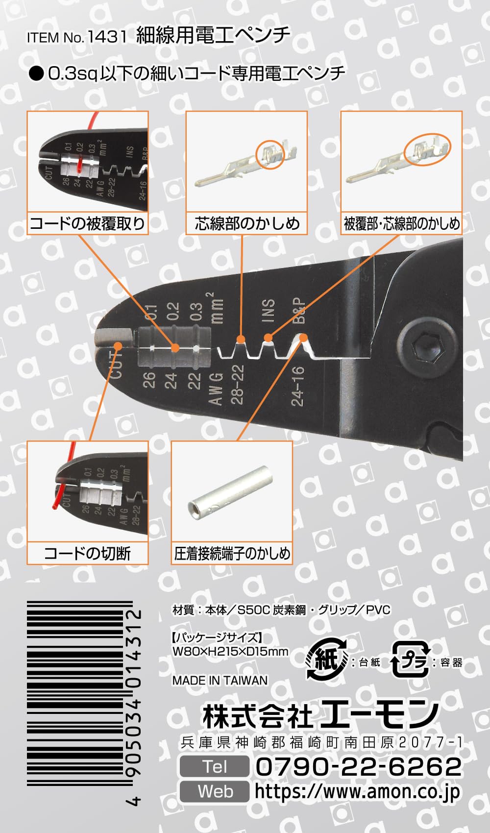 エーモン(amon) 細線用電工ペンチ 全長約160mm 配線コードの接続・分岐に ドラレコの電源取り出し 電装品の取り付け・配線作業 1431