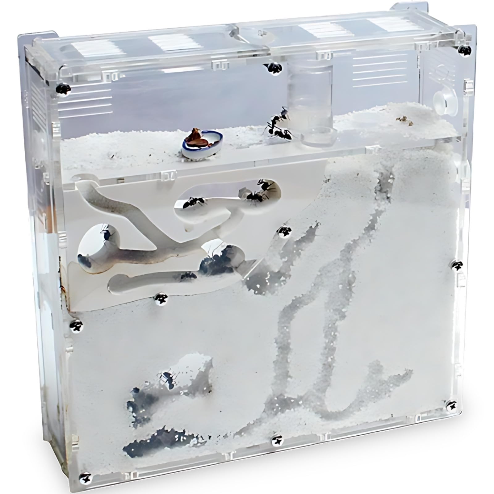 アリの生態を研究して設計された巣穴が最初からできあがっているので、数の多いコロニー(群れ)もすぐに投入する事ができます。衝撃等で巣が壊れたりすることもありません。巣穴は3D立体構造となっており、表側は多数の部屋に分かれた構造、裏側は通路や貯蔵庫に適した構造となっています。