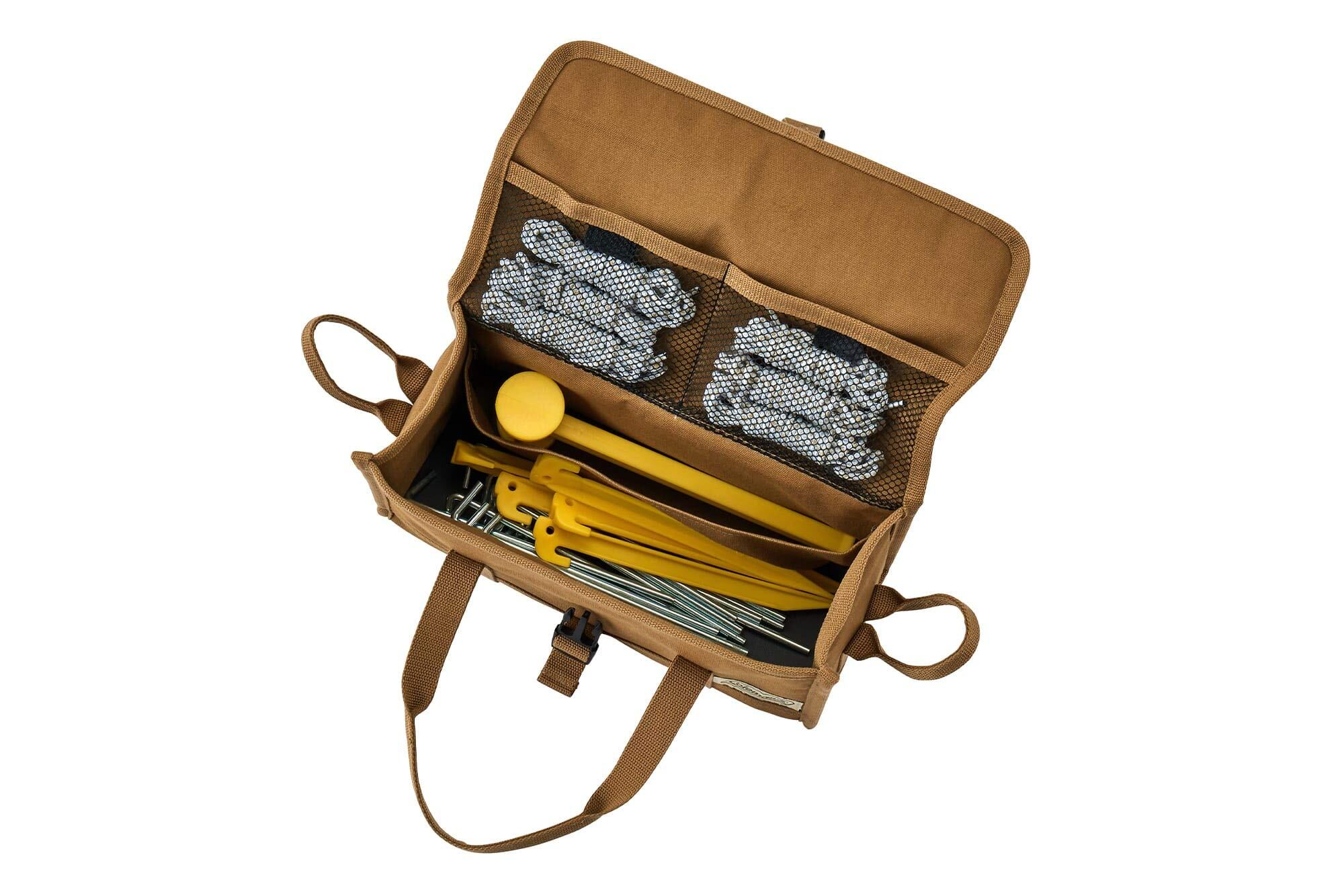 【使用シーン】 テントやタープを設営する際に使用するペグやハンマー、ロープなどをまとめて収納・整理するためのケースです。バラバラになりやすいペグをしっかりと保管し、持ち運びやすくする便利なアイテムです。