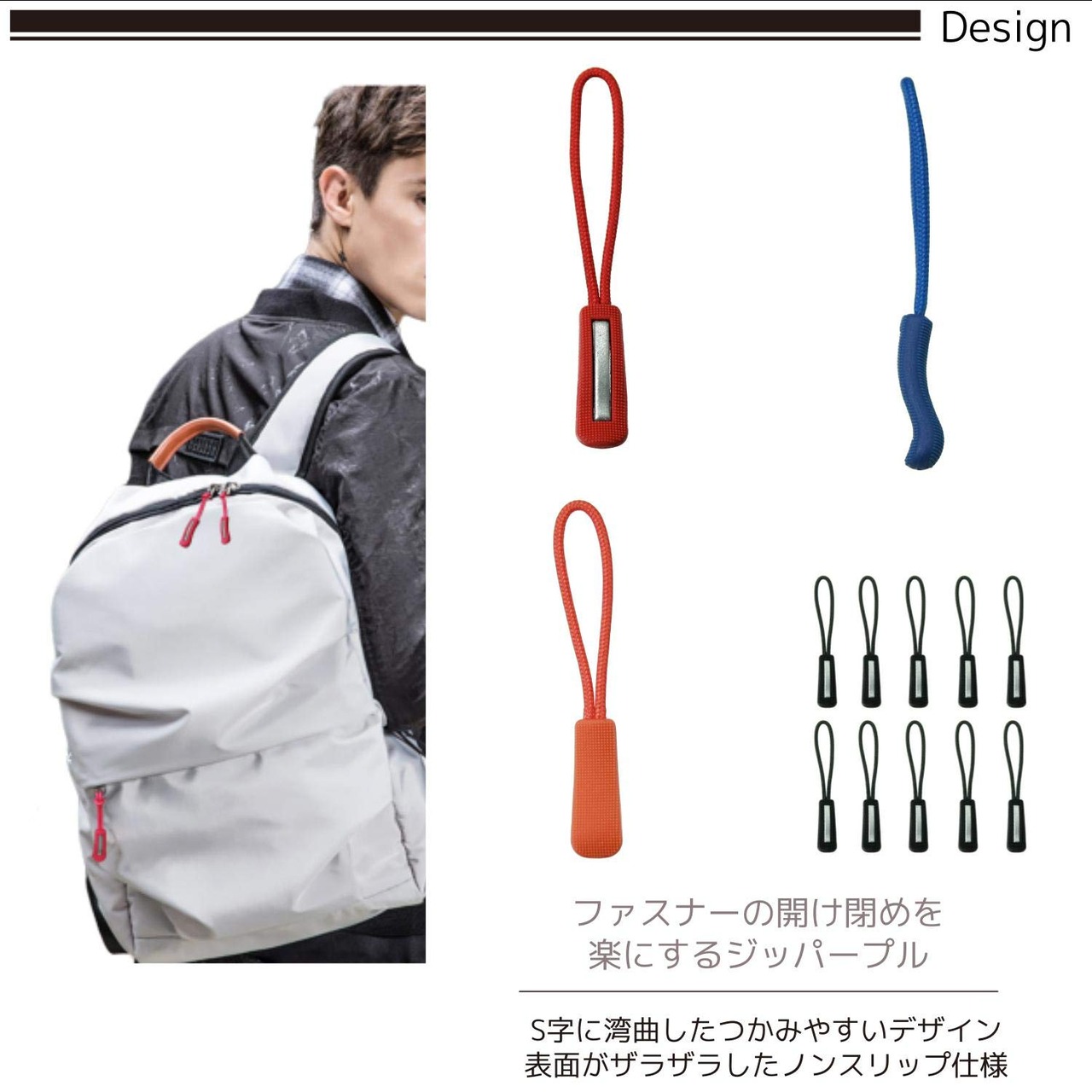 ファスナーの開け閉めを楽にするジッパープル、5カラー各10本セットです。ファスナーの引手に取り付けることで持ち手が長くつかみやいタブなります。手袋をしたままでもスムーズにプルアップが可能になり大変便利です。