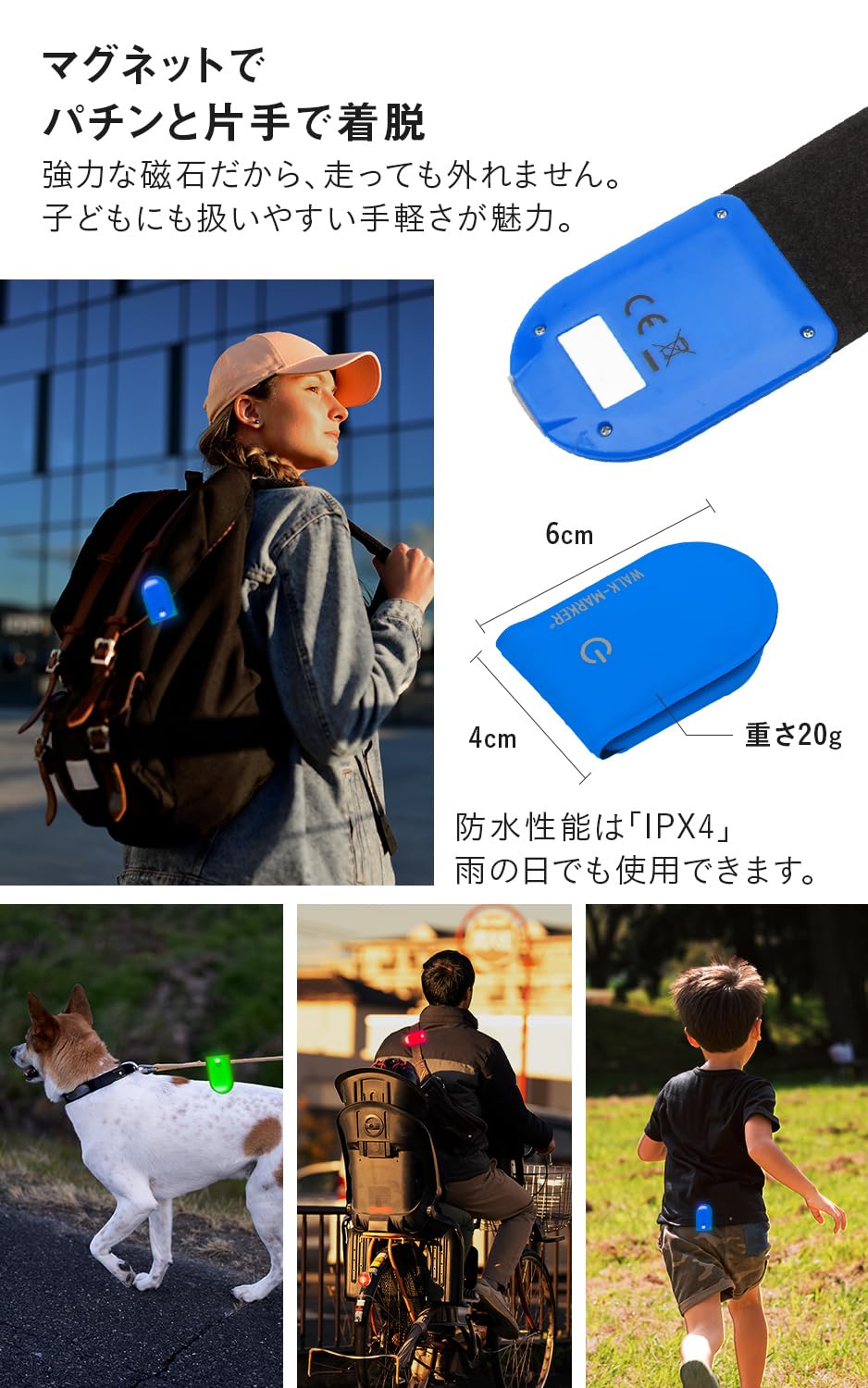 ?【マルチに使えるセーフティーライト】WALK-MARKERはマグネット式のLEDクリップライトです。夜間のランニング、ジョギング、ウォーキングや犬の散歩、オートバイや自転車での通勤通学などの安全対策にご利用いただけます。自動車のドライバーや自転車の運転者、歩行者にも視認してもらえます。また、このような安全ライトを身につける事により不審者ではないというアピールにもなり、周りの人に安心感を与えるられます。