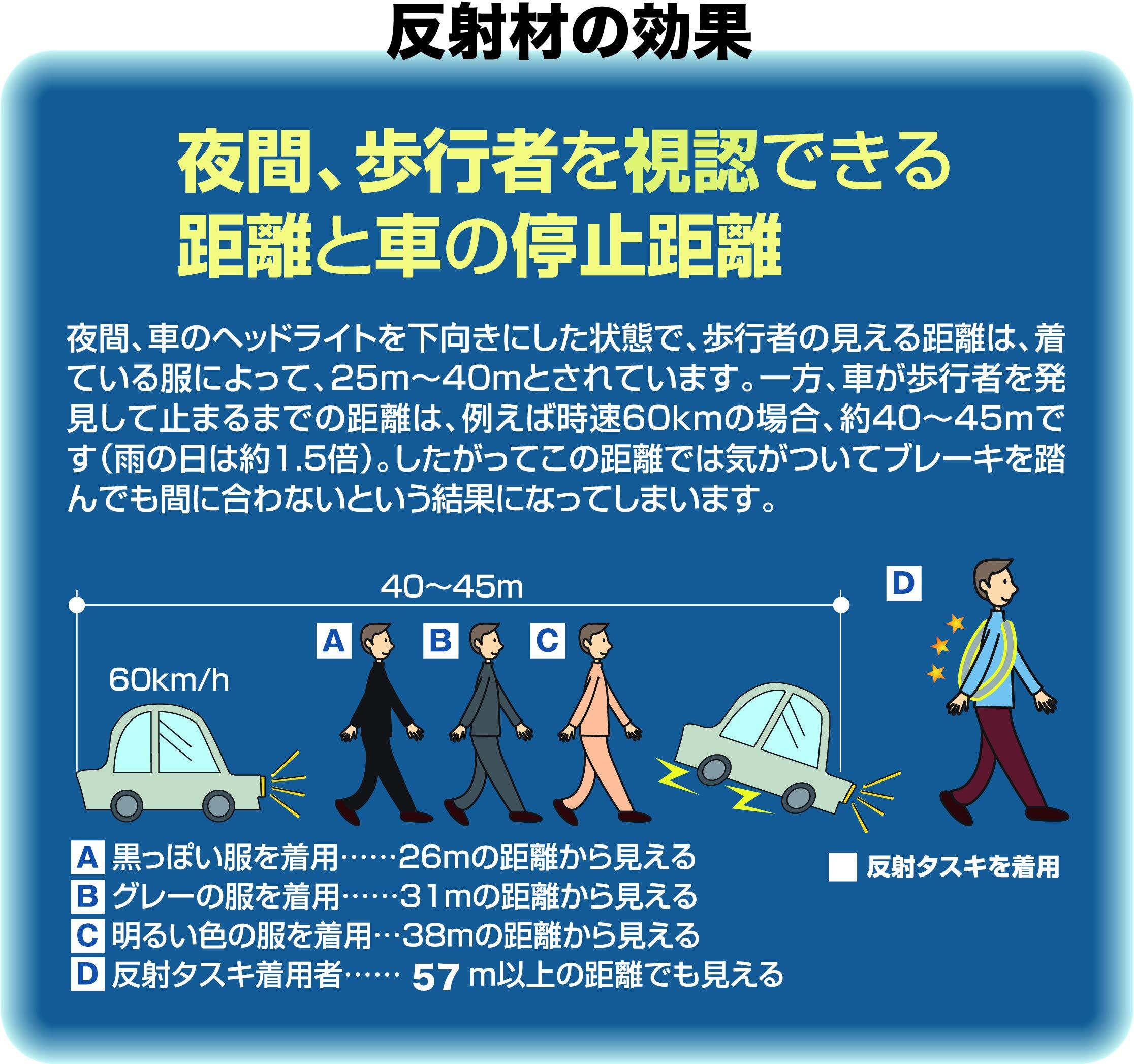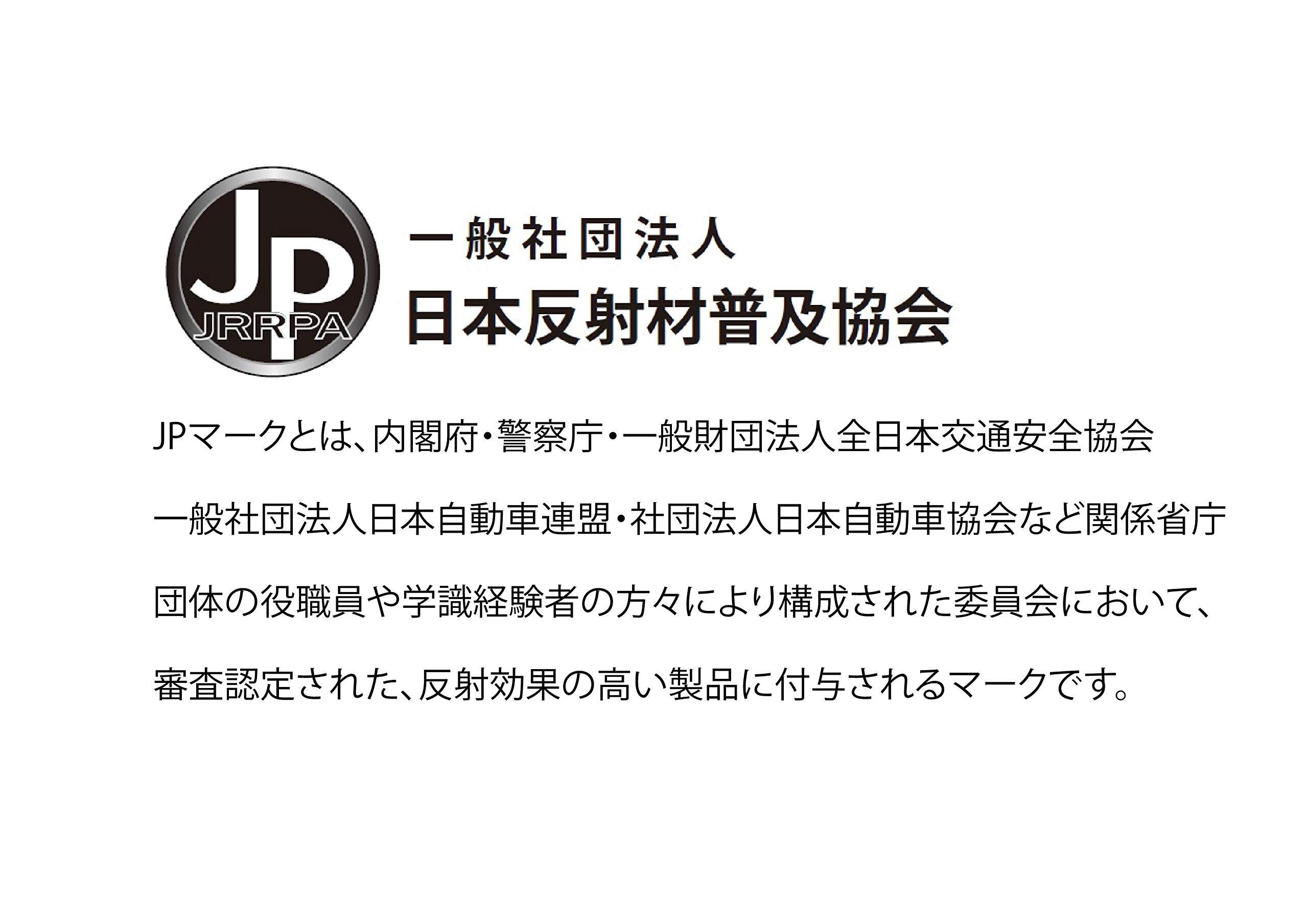 交通安全【日本反射材普及協会認定品 認定番号23009】 (一社)日本反射材普及協会認定品 (JPマーク取得) :JPマークとは内閣府・警察庁・一般財団法人全日本交通安全協会・一般社団法人日本自動車連盟・社団法人日本自動車協会など関係省庁・団体の役職員や学識経験者の方々により構成された委員会において、反射効果のある優れた製品として審査認定されたものです