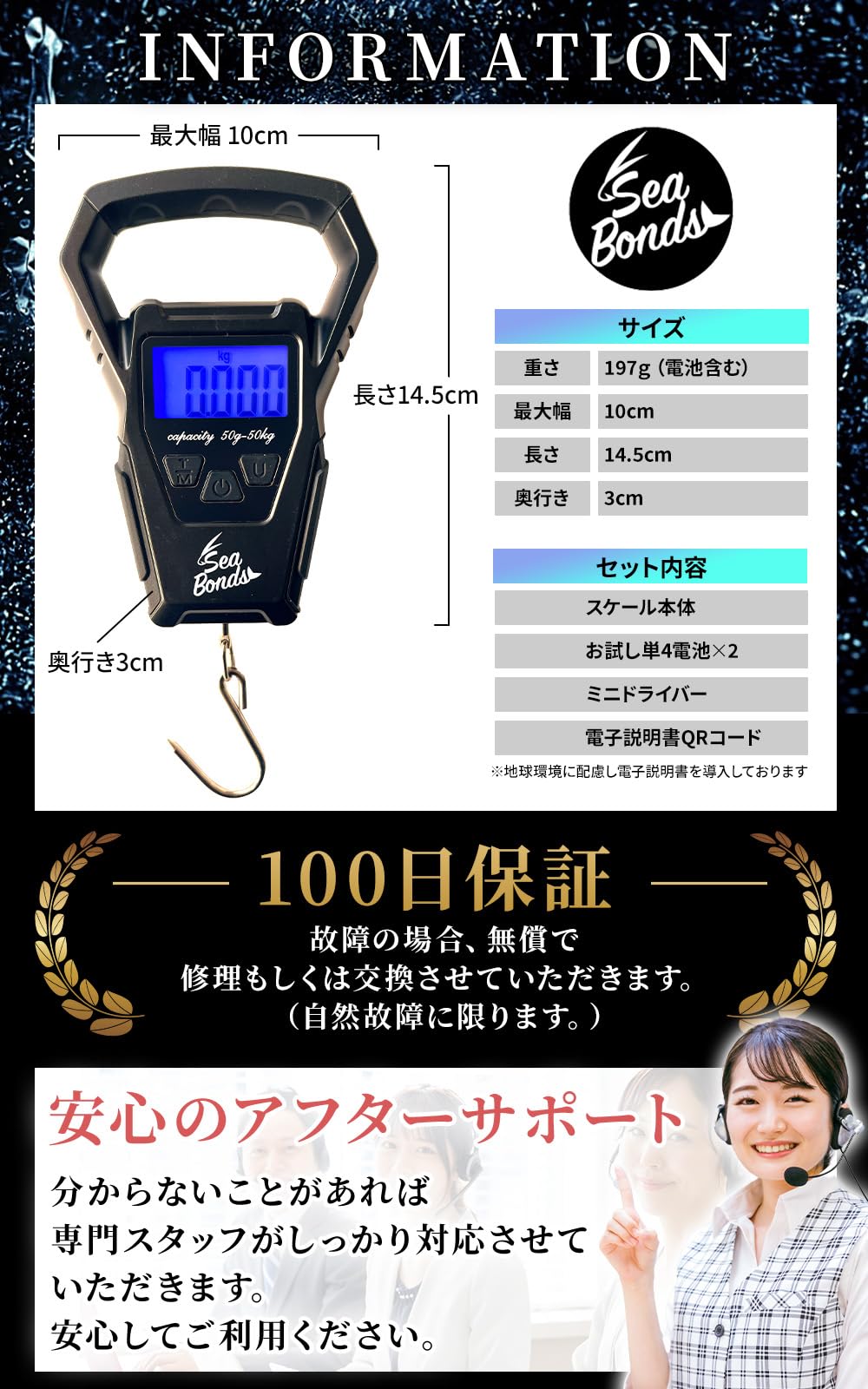 フィッシングスケール 防水 デジタルスケール 釣り IPX7 日本ブランド 100日 スケール 吊りはかり 吊りスケール デジタル秤 釣りはかり Gスケール 計測ツール アウトドア 軽量 50kg バックライト付 ドラグチェッカー 説明書付き (ブラック) シーボンズ