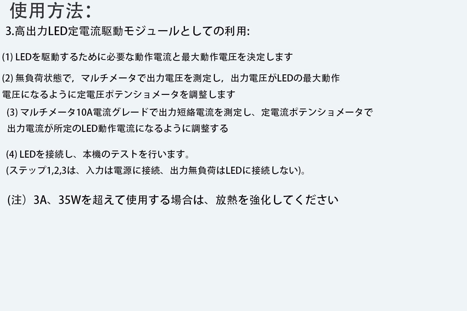 主な制御装置、スイッチとしての外部60V 75A MOS管、デュアル60V 5A SS56ショットキー整流、60V電圧値、昇順で使用し、市場の未熟なXL6009 / LM2577プログラム降下チップ(多くの装置の圧力値は 不十分な場合、MOS管とショットキー・ダイオードの圧力値は入力電圧と入力電圧値の和より大きくなければなりません。【ご不明な点がございましたら、お気軽にお問い合わせいただくか、リンク先のPDFマニュアルをご覧ください】注意:1.モジュール入力IN-と出力OUT-を短絡することは禁止されており、そうでなければ定電流機能は無効になります。2. 出力負荷が必要とする電力よりも、常に大きな電力を供給するようにしてください。3.モジュールが全負荷で出力したい場合、入力電圧は8V以上でなければなりません。 入力電圧が5Vの場合、出力電力は約15Wで電圧-電流計は故障します。 モジュール電流値MAX 4A、前提は出力17VなどのMAX出力電力によって制限され、電流は2A以上であってはならない。
