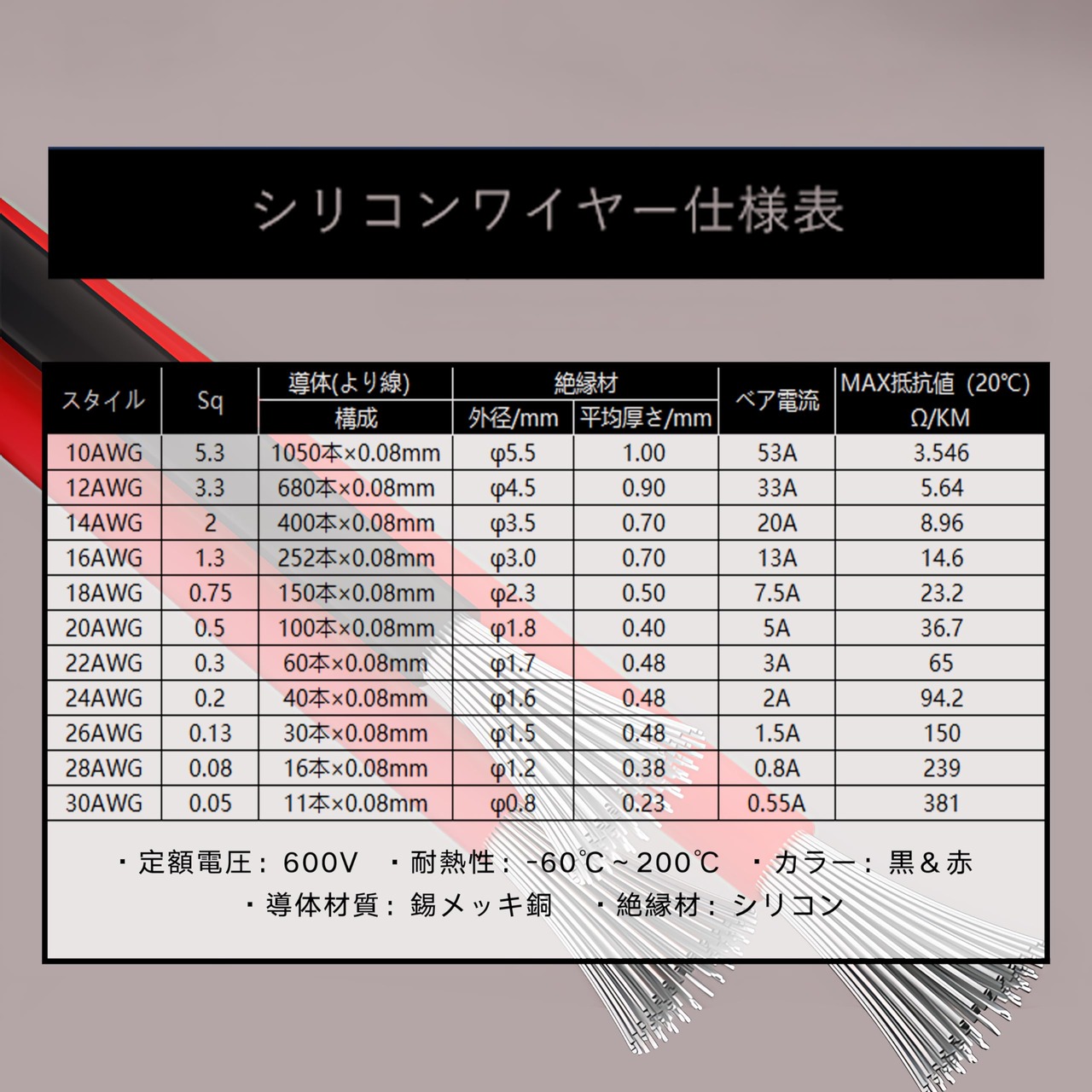◆公称電圧:600V 耐熱性:-60℃〜+200℃ ベア電流:8.2A