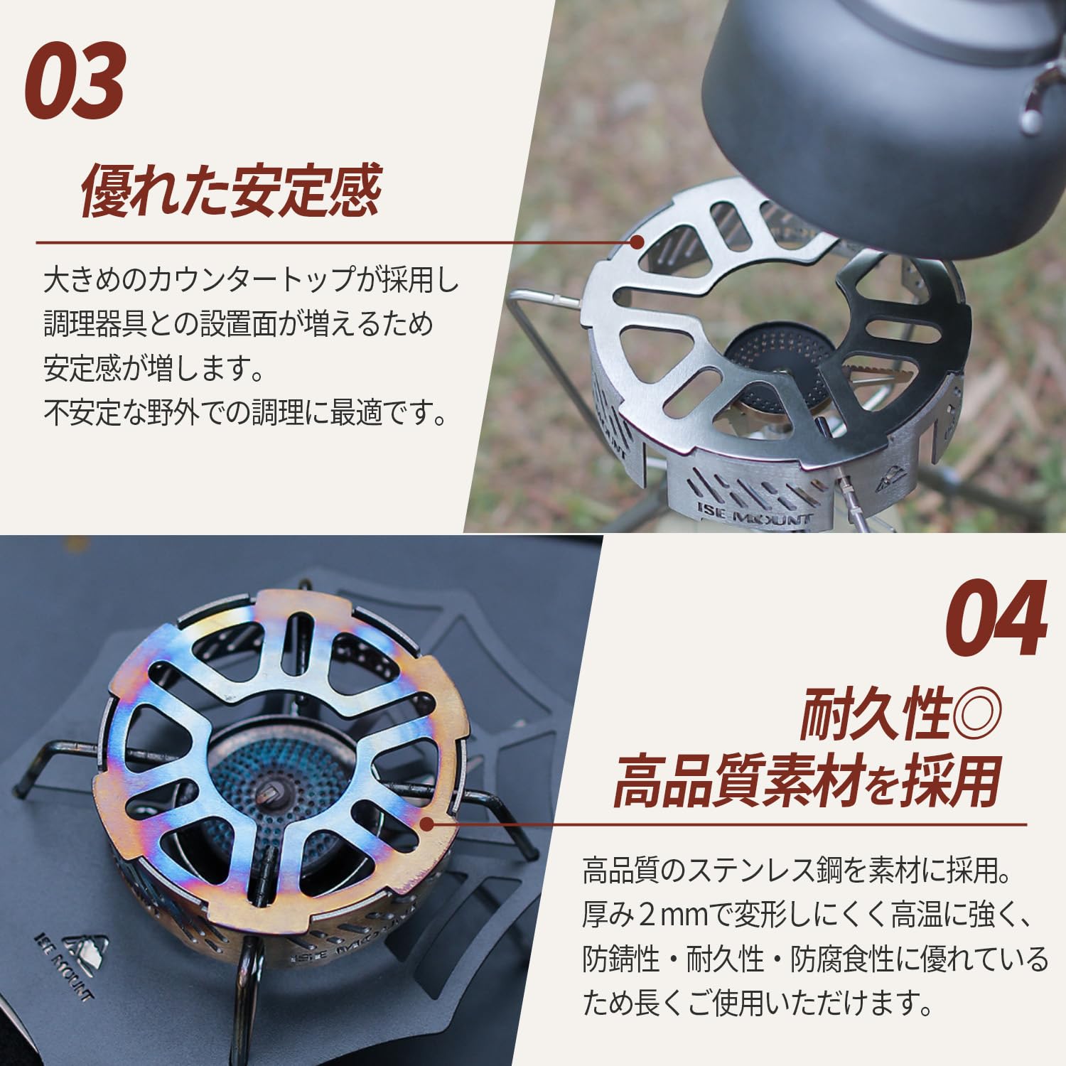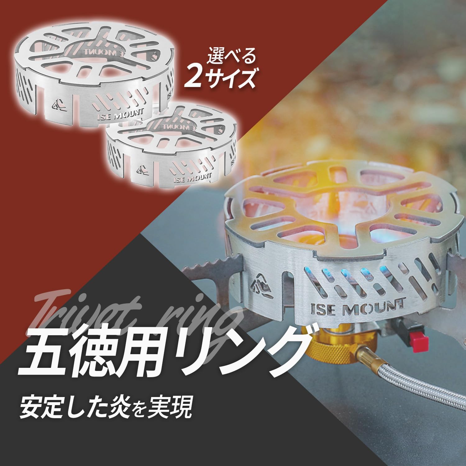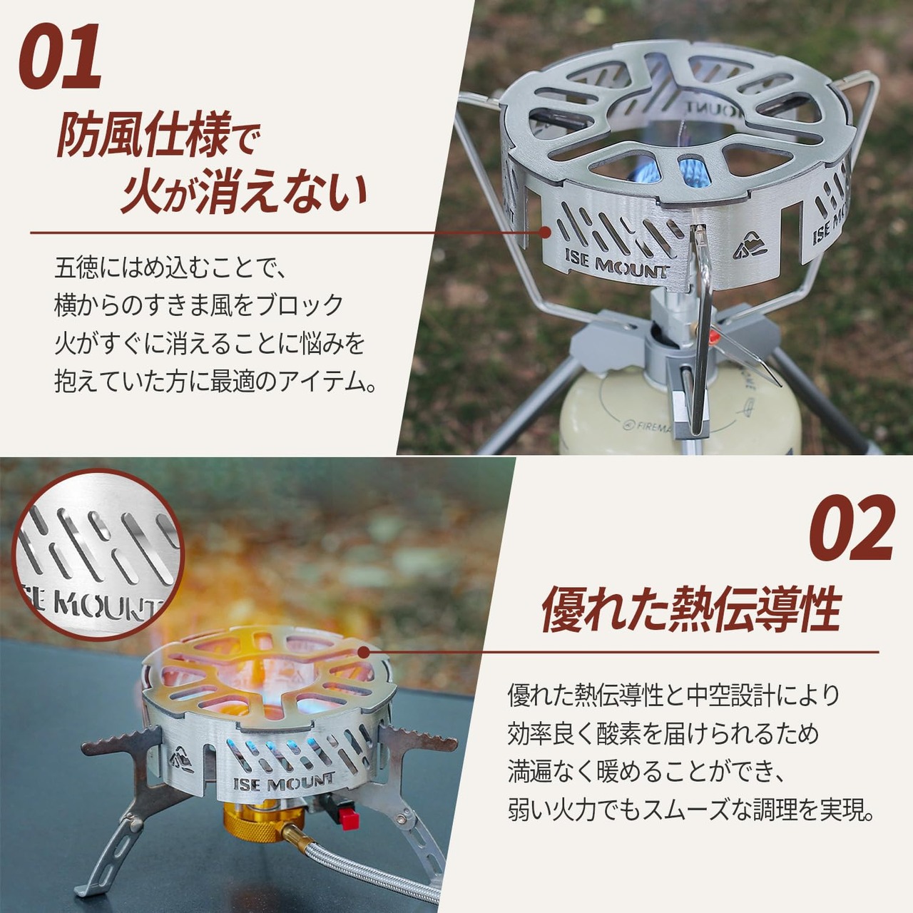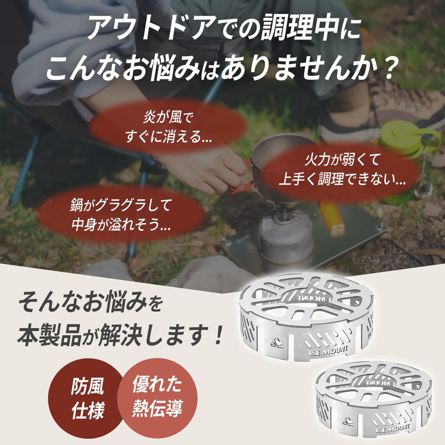 ?風防リングが風を防ぎ、熱効率の向上をさせます。外での料理を一層楽しく、かつ効率的にします。軽量で持ち運びやすく、美味しい料理を作る喜びを、アウトドアで存分に味わいましょう。