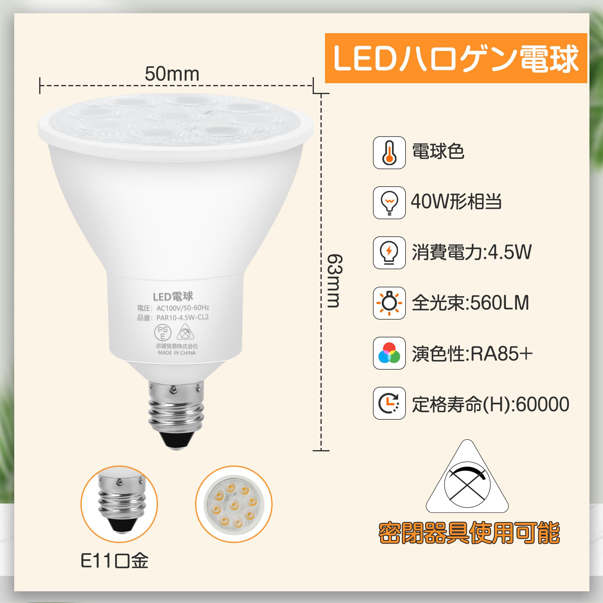 LED ハロゲン電球 E11 LED スポットライト 40W形相当 5年 E11口金 LED電球 電球色 2700K 4.5W 560lm ビーム角40° 広角タイプ 密閉器具対応 非調光 キッチン 間接照明 天井照明 看板用ライト 店舗 洗面所 玄関照明 6個入り