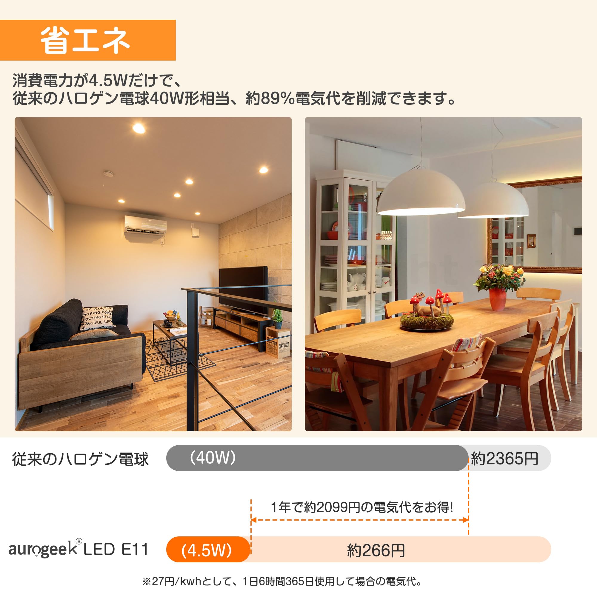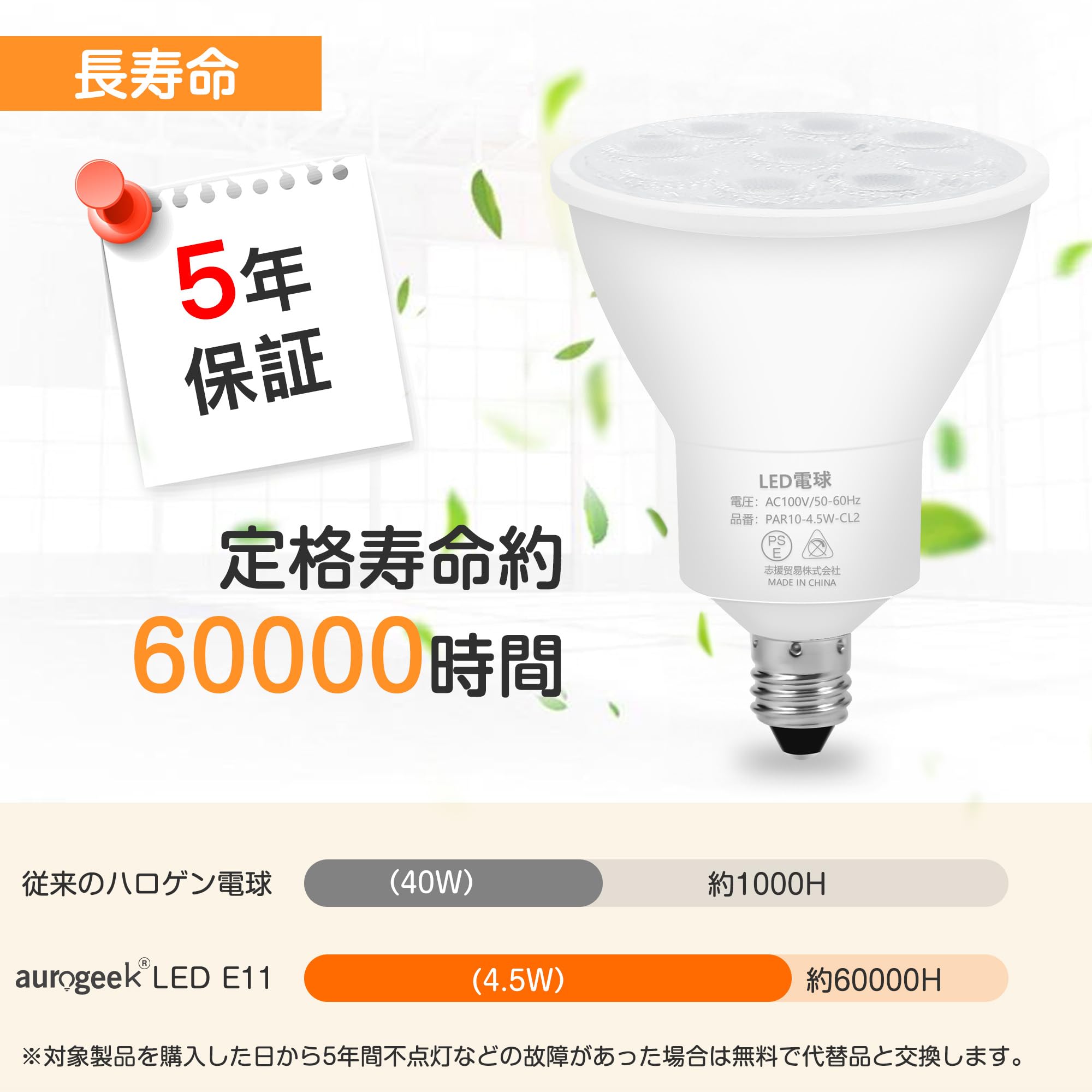 【省エネ・5年】消費電力が4.5Wはわずかで、従来のハロゲン電球40W形相当、e11 led 電球色は約89%電気代を削減できます。当社の E11 LED 電球はマグネシウム合金を採用したチップは、寿命が長くなり、5 年間の品質を提供いたします。対象製品を購入した日から5年間不点灯などの故障があった場合は無料で代替品と交換します。信頼性の高い品質とサービスを提供しており、安心してご利用いただけます。