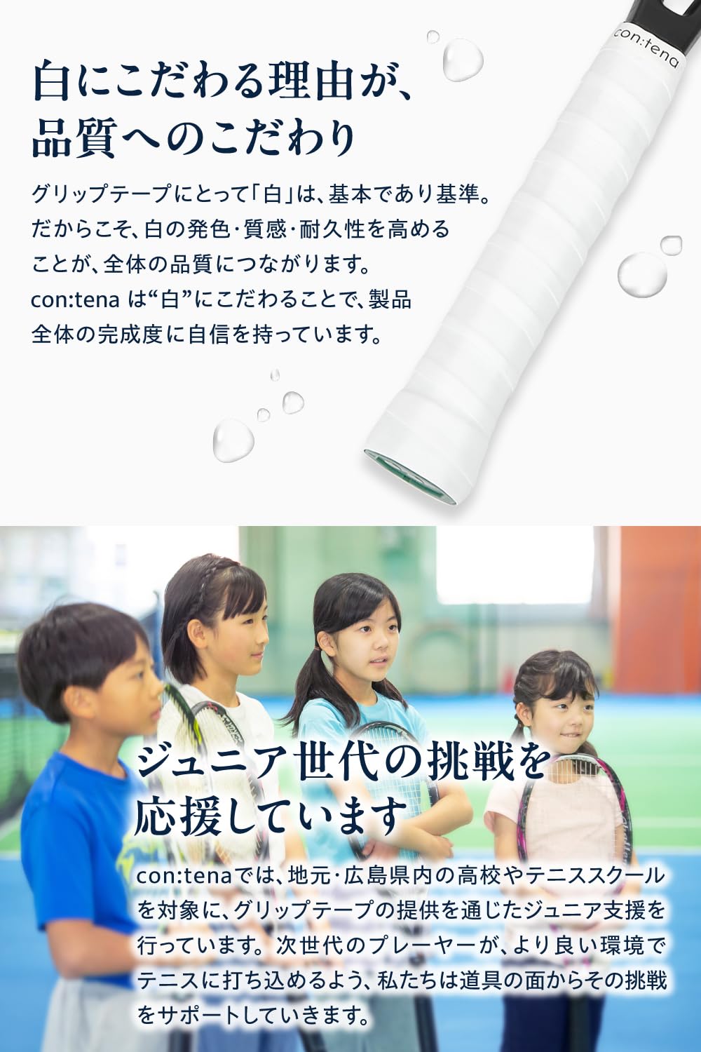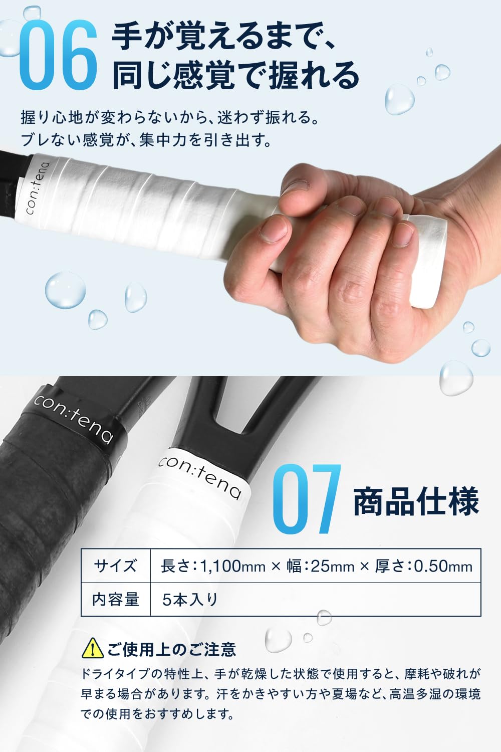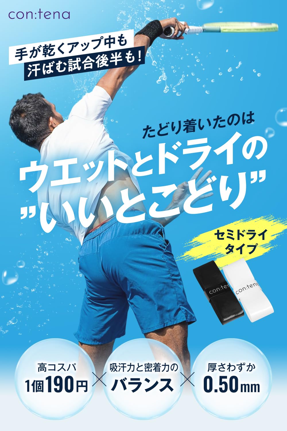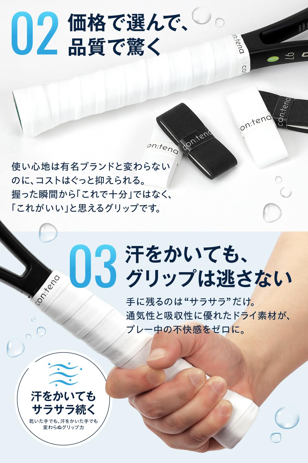 con:tena グリップテープ ドライ テニス バドミントン セミドライ オーバーグリップ 薄型 コスパ 白 黒 MellowGrip