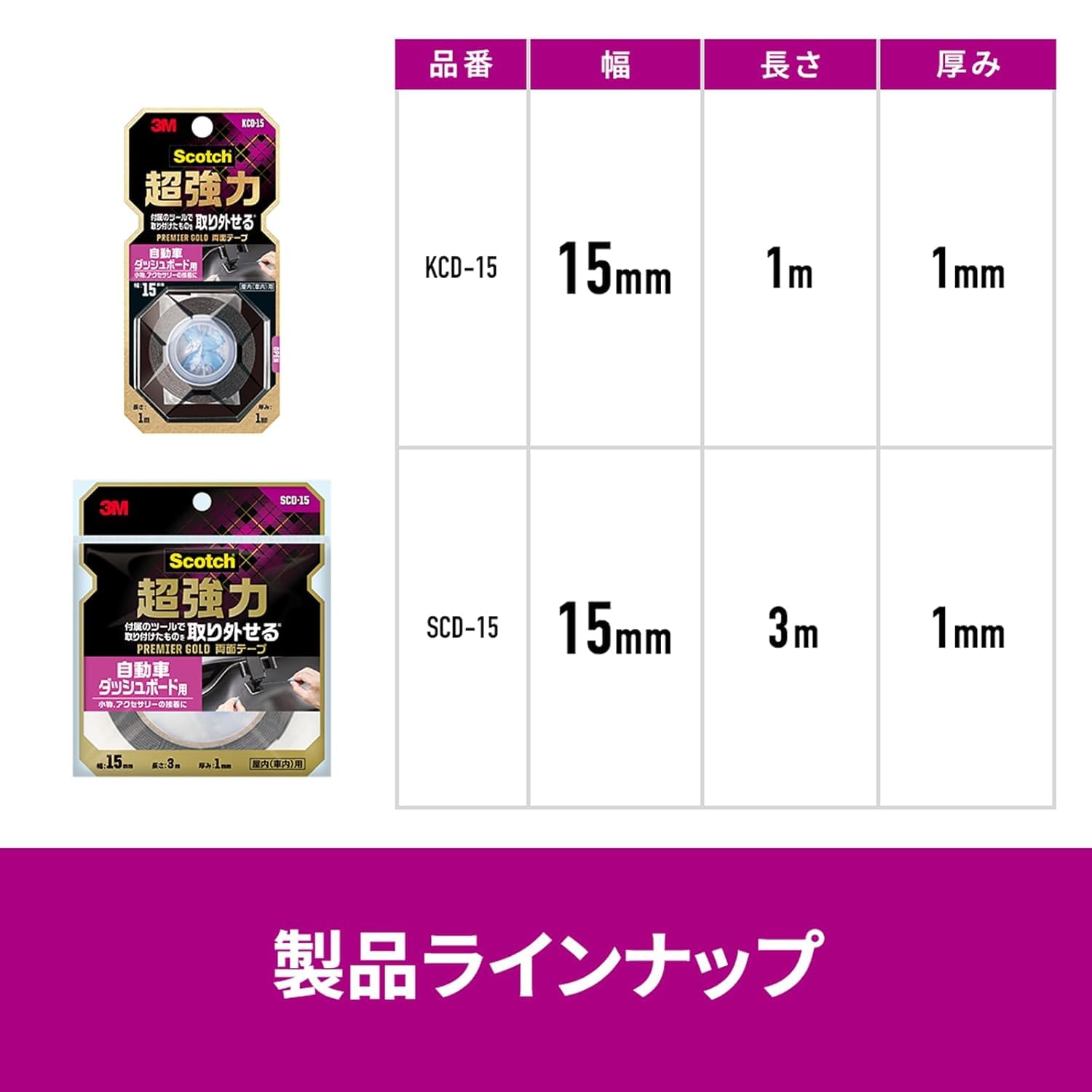 3M 両面テープ 超強力 自動車ダッシュボード用 取り外せる 幅15mm 長さ3m スコッチ SCD-15 セミロング プレミアゴールド