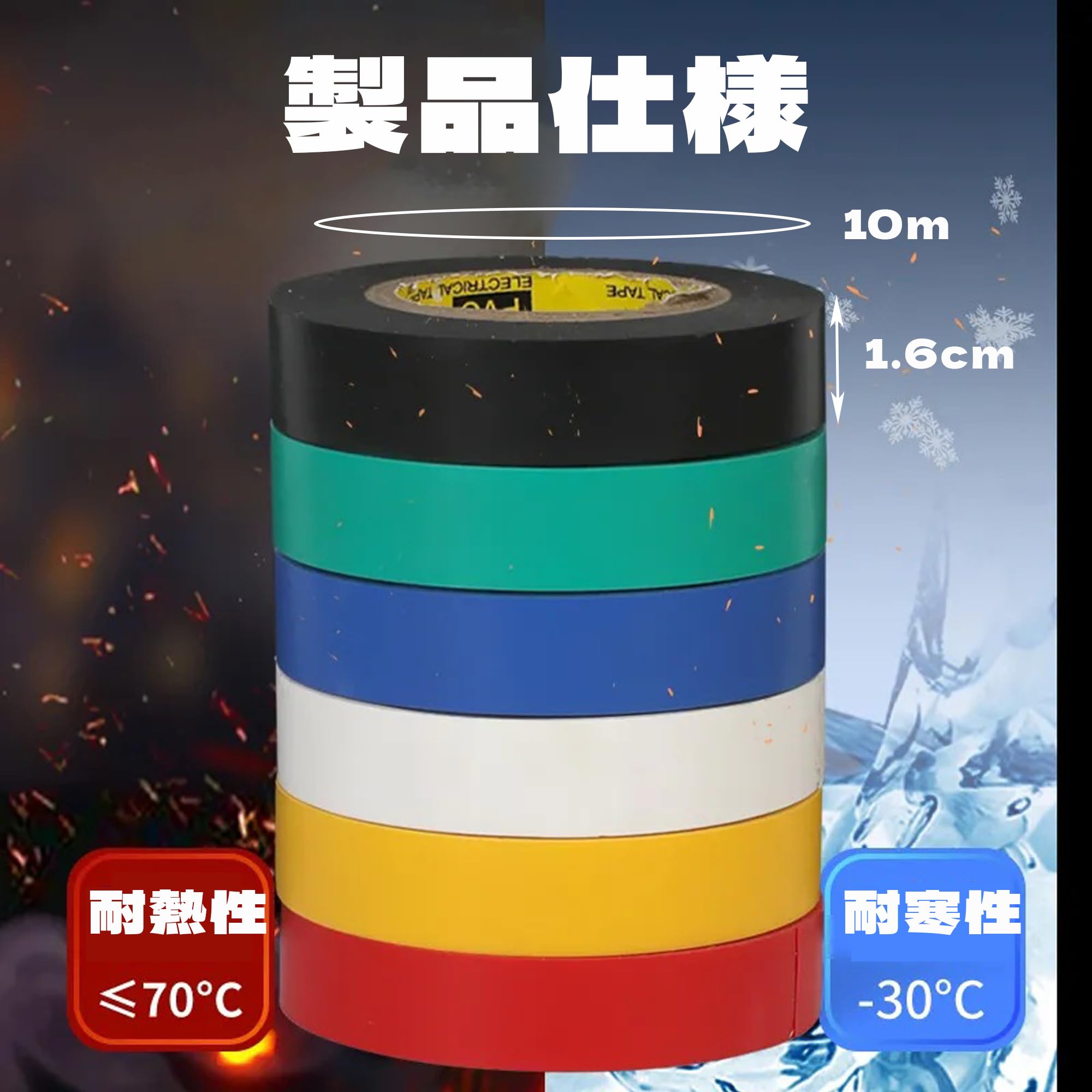 電気 絶縁テープ 6色入 16mm×10m ビニールテープ カラーテープ 強粘着力 気絶縁 防水 耐熱 補修 水道管の防水 電気工事用 ハーネス・コード色分けに最適 カラー(赤 黄 緑 青 白 黒)