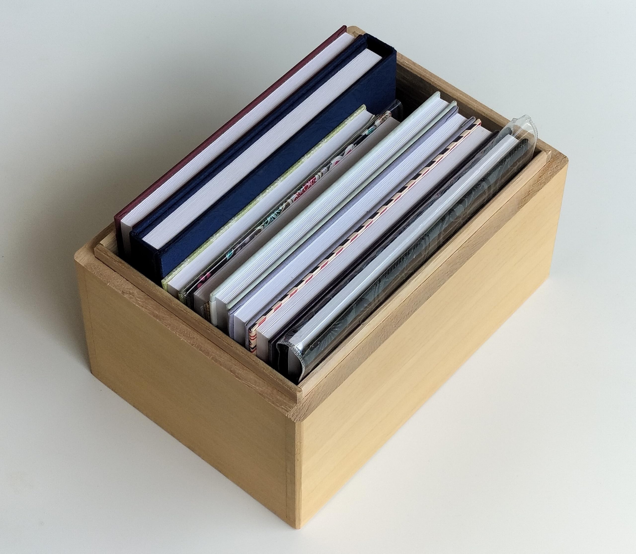 大判サイズ(12×18)の御朱印帳を7冊〜8冊収納できる保存ケースです ケースカバー付の状態でも収納できるよう幅を調整しています