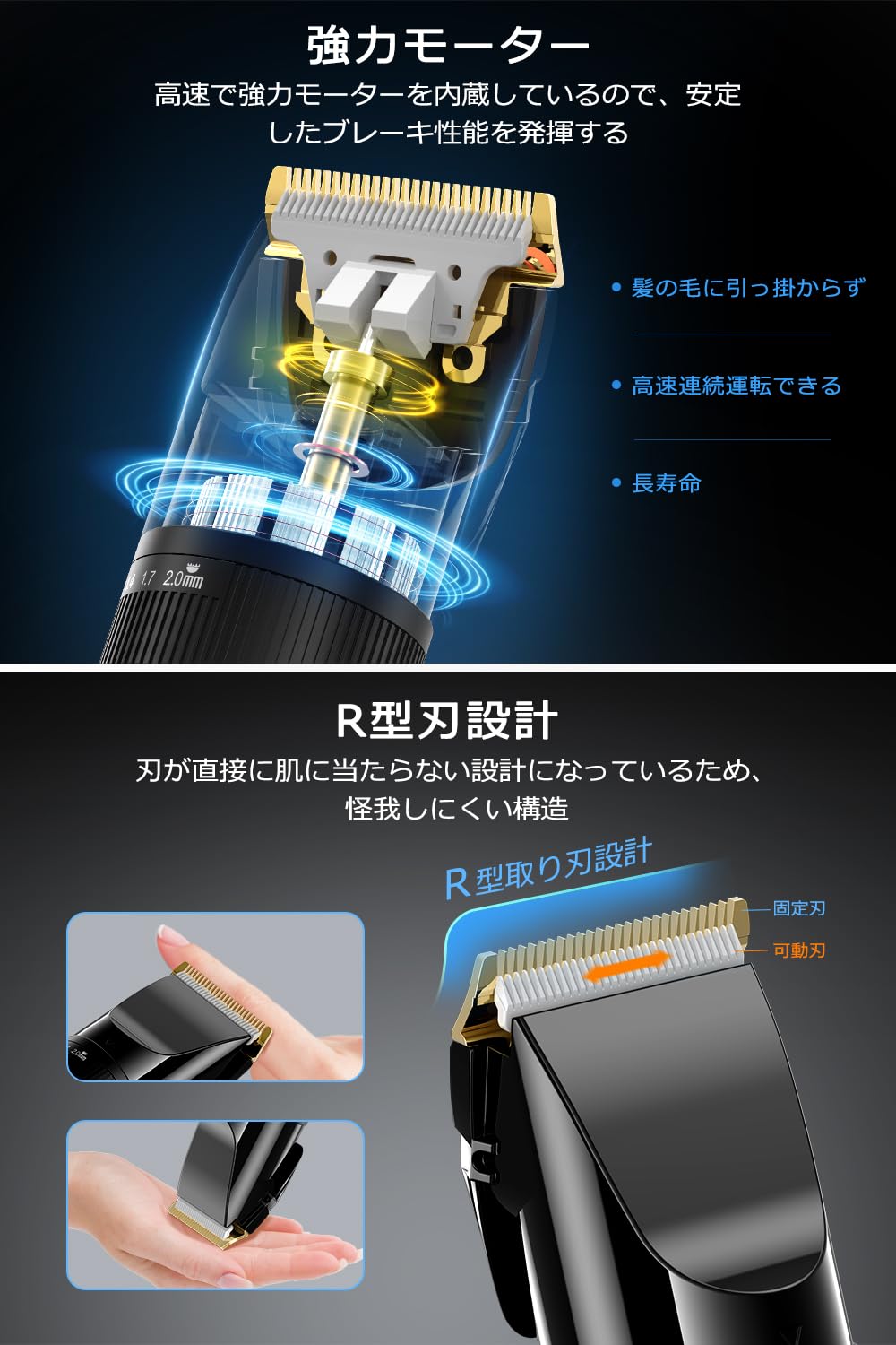 ?【切れ味長持ち&安全設計】 セラミック可動刃+ステンレス固定刃の高品質構造で、産毛から剛毛までスムーズにカット。自動研磨機能付きで髪に絡まず、長期間切れ味が持続します。毛くずがたまりにくい設計でお手入れ簡単。さらにR型安全刃で肌を傷つけにくく、敏感肌や子供のカットにも安心して使用できます。
