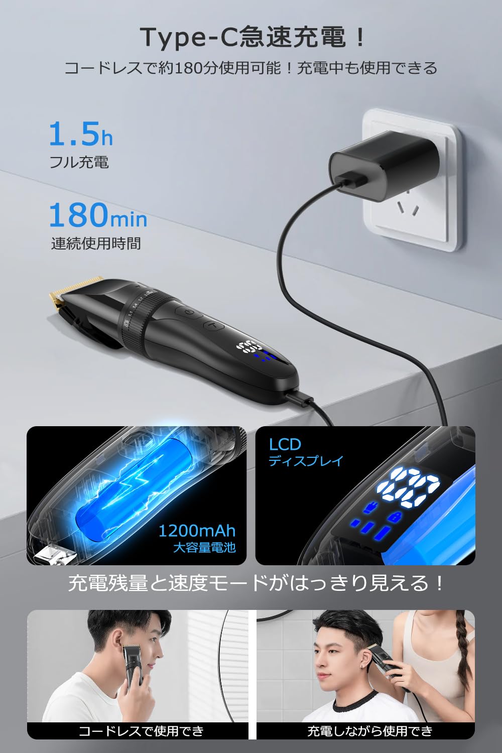 ?【Type-C急速充電&コードレス/有線両用】 最新のType-C充電式 バリカン は、1.5時間充電で最大180分連続使用可能。大容量1200mAhバッテリー搭載で長時間使用に対応し、頻繁な充電の手間を軽減。コードレス設計だから場所を選ばず、旅行・出張・自宅で便利に使用可能。さらに充電しながらの使用もOKで、忙しい朝でも安心。プロフェッショナル仕上げを求める方におすすめです。