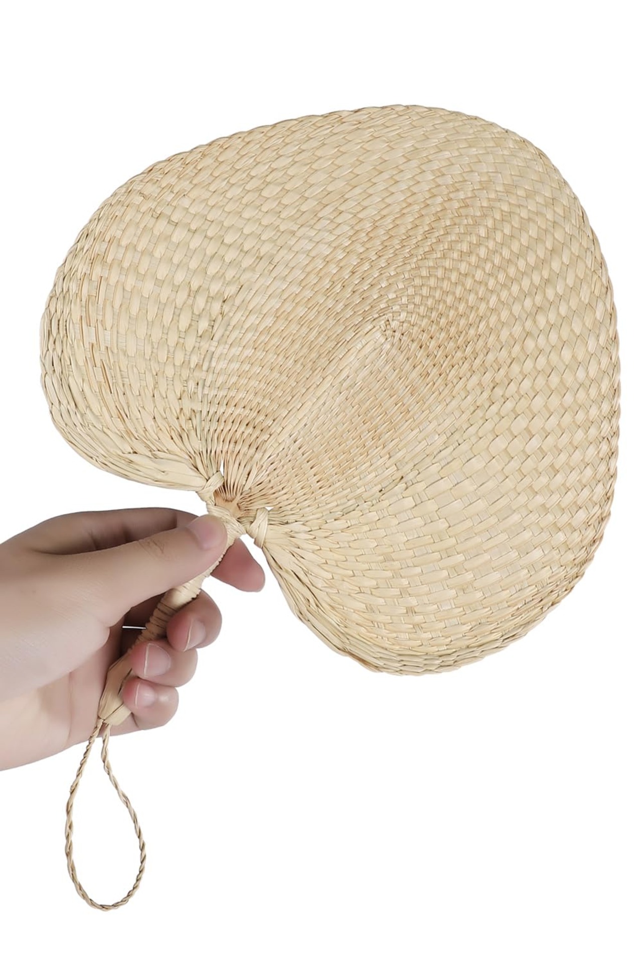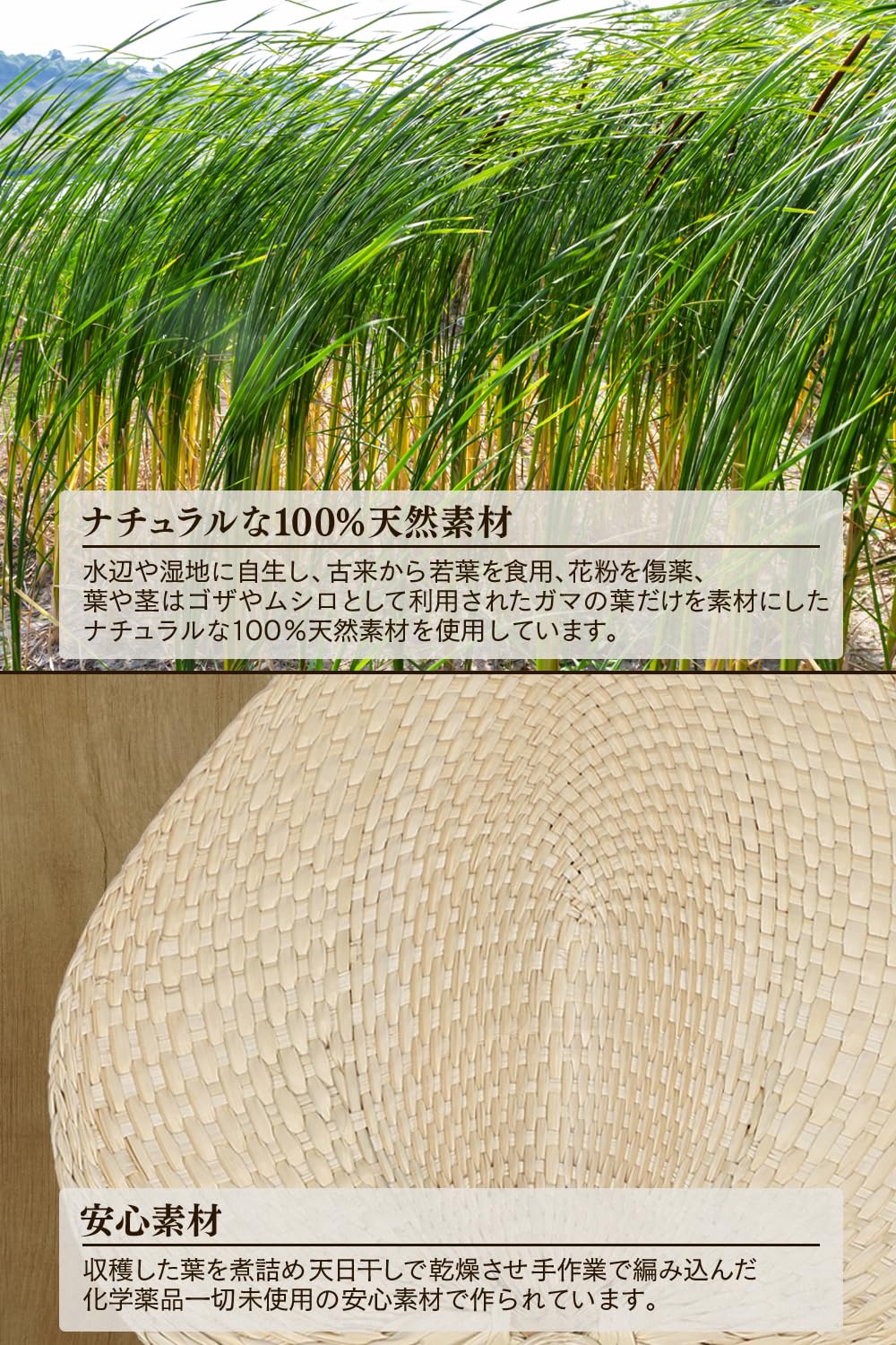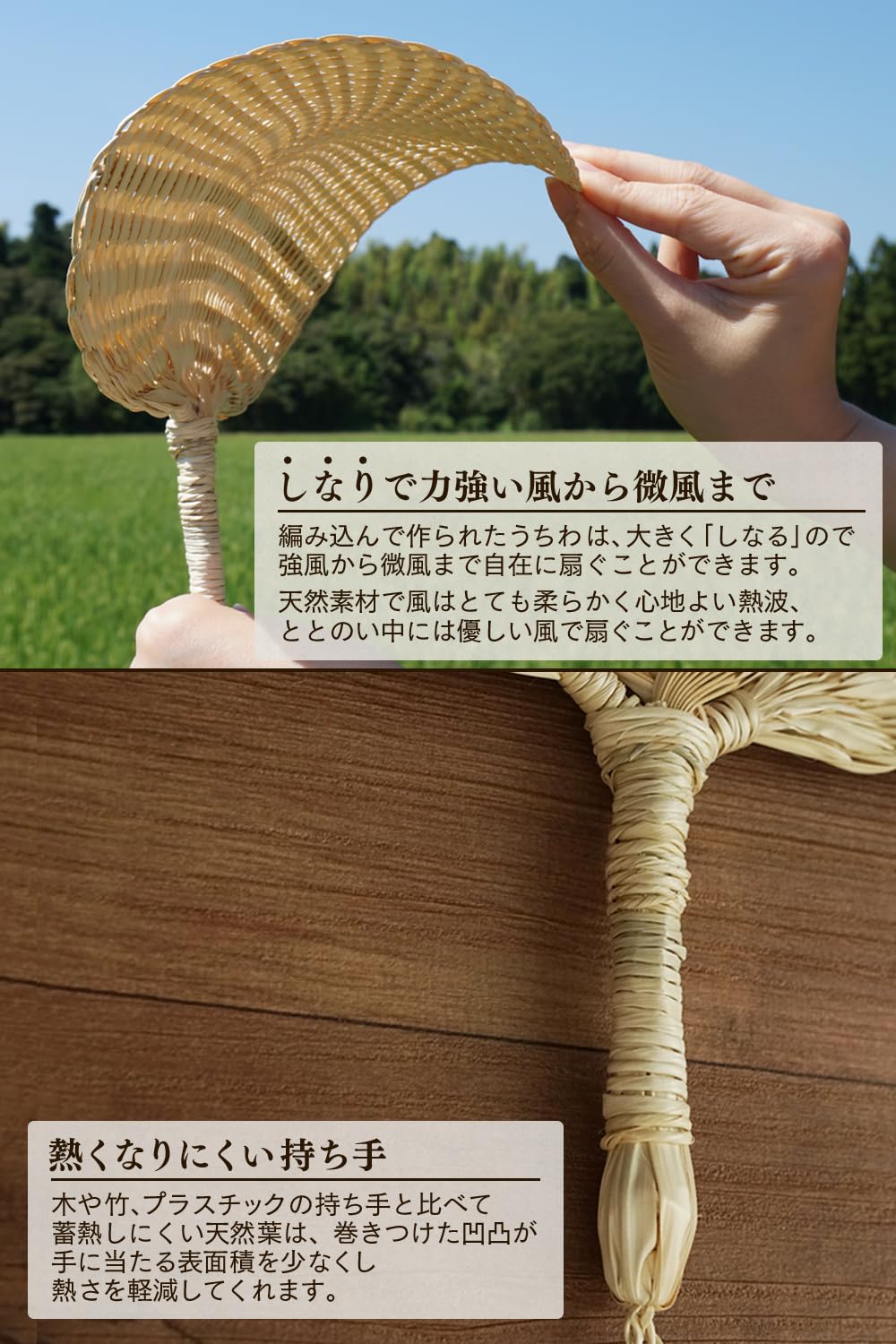 100%天然素材のガマの葉を編み込んだナチュラルなセルフ熱波うちわ。