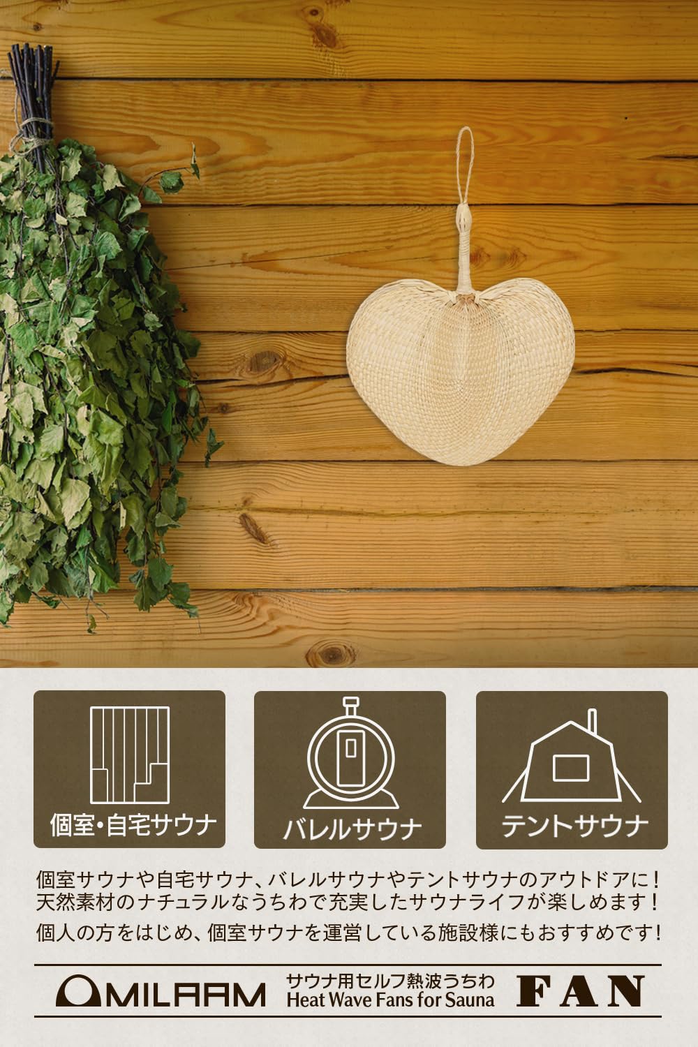 【MILAAM】 セルフ熱波うちわ 「FAN」 サウナ 熱風 涼風 天然素材 団扇