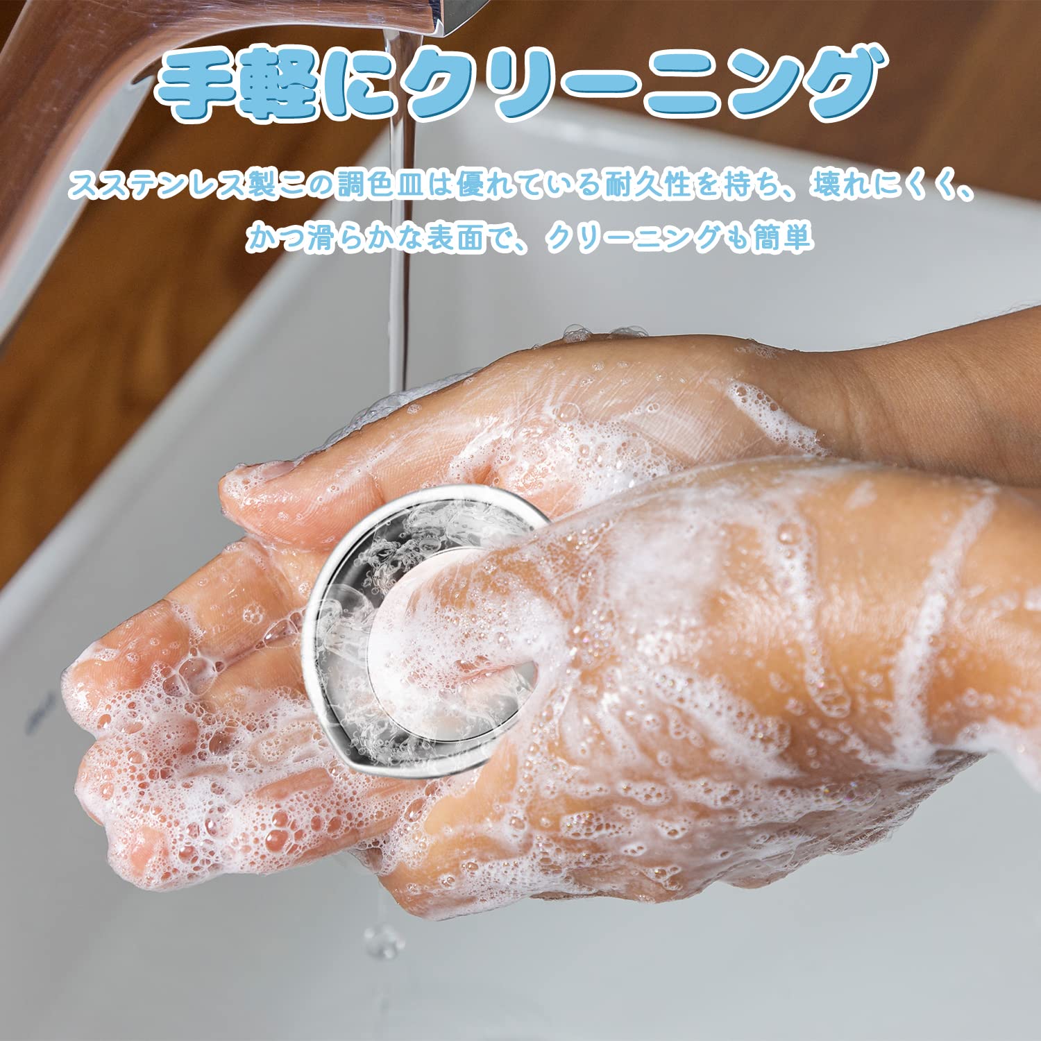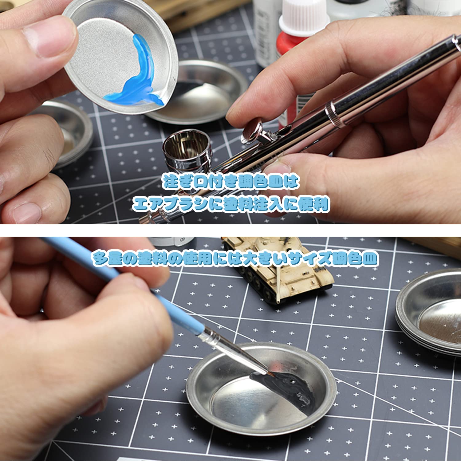 「注ぎ口付き調色用塗料皿」12個の小さいサイズの塗料皿は注ぎ口付きですので、調色用かくはん棒を使用した後、素早くエアブラシなどの使いたい容器に注げます。大容量の塗料皿2個はより多量の塗料を使いたい場合に対応します。ステンレス製で錆びにくく、耐久性を持っており、さらに優れた強度でほとんど変形にならず、より長持ちな仕様です。滑らかな金属製ですので、水性アクリル塗料はもちろん、ラッカー塗料も落としやすです。より多い回数使用できます。
