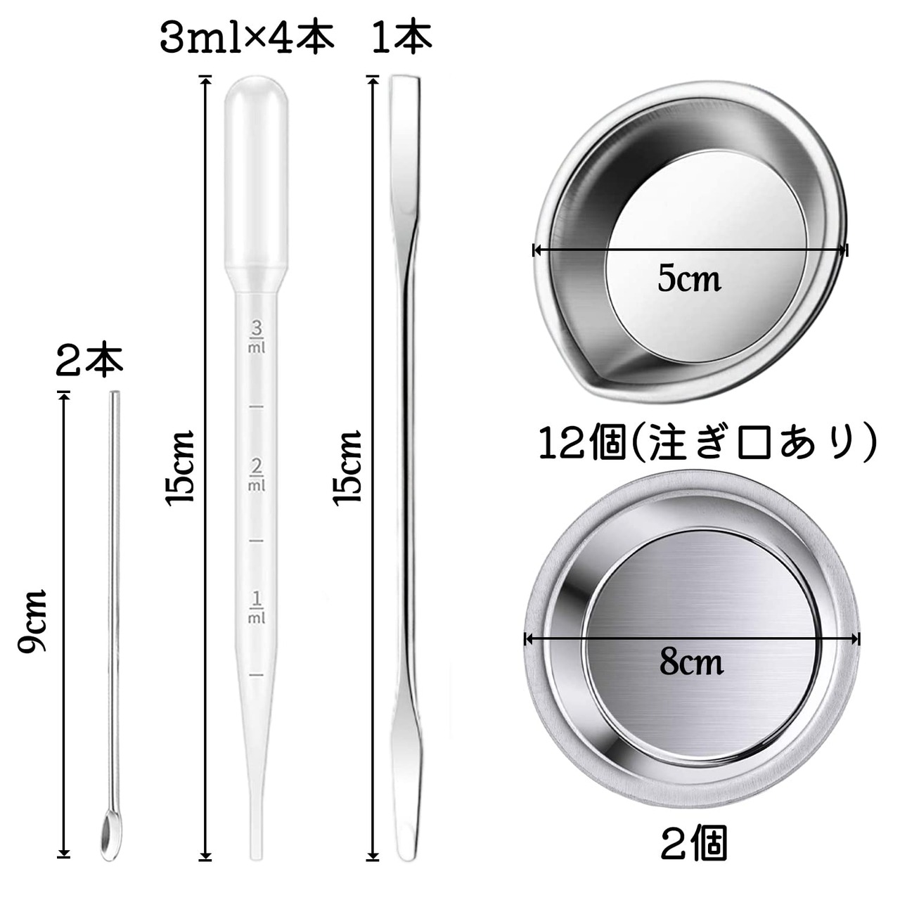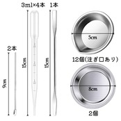 「プラモデル 工具セット」ステンレス製塗料皿大きいサイズ×2、注ぎ口付き小さいサイズ×12、スプーン形調色スティック×2、両端タイプかくはん棒×1、3mlスポイト×4。プラモデル、フィギュア制作のベテランでも初心者でも不可欠な塗装工具セットです。場合によって絵の具のペイントセットと併用しても良いです。