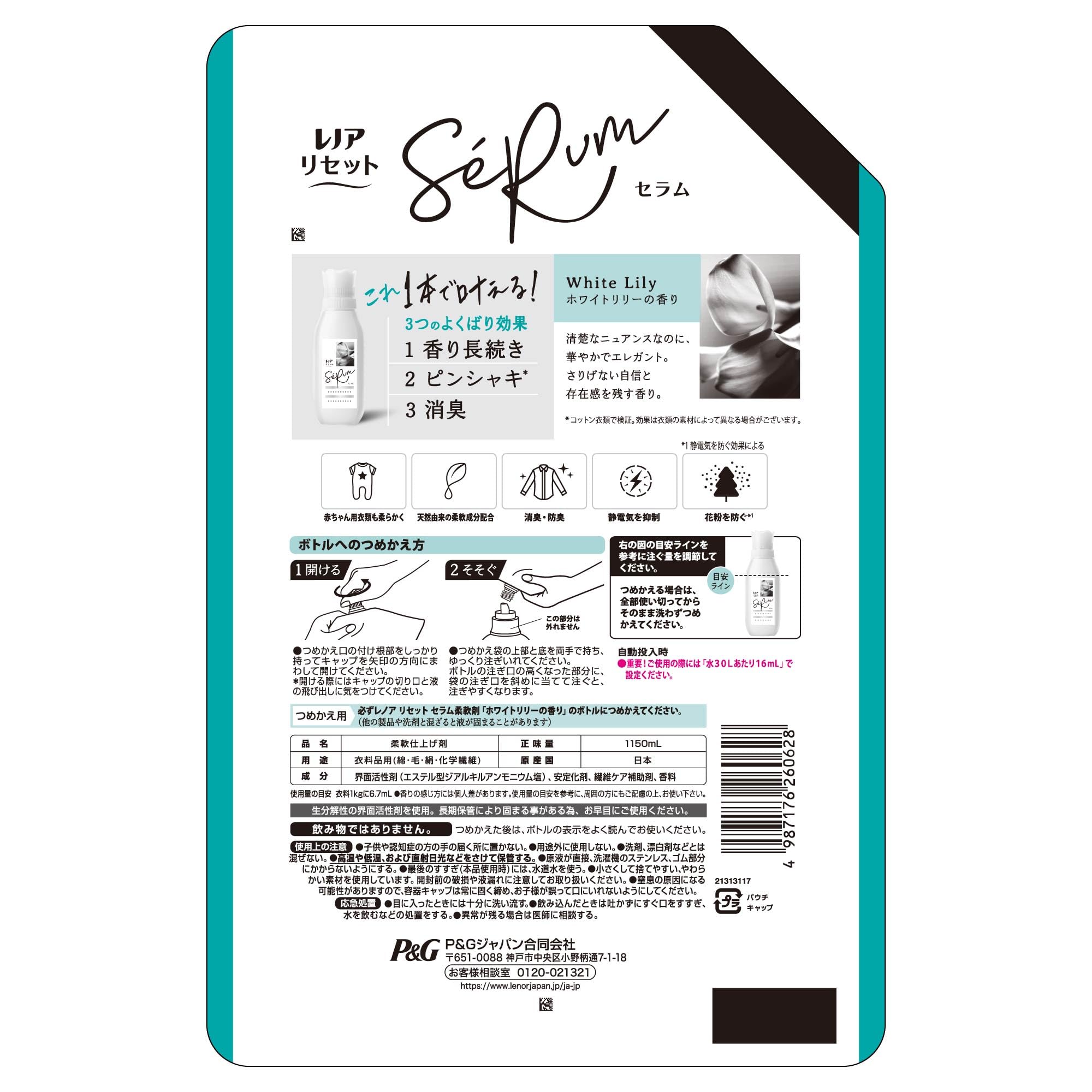 レノア リセット セラム 柔軟剤 ホワイトリリー 詰め替え 1,150mL [大容量]