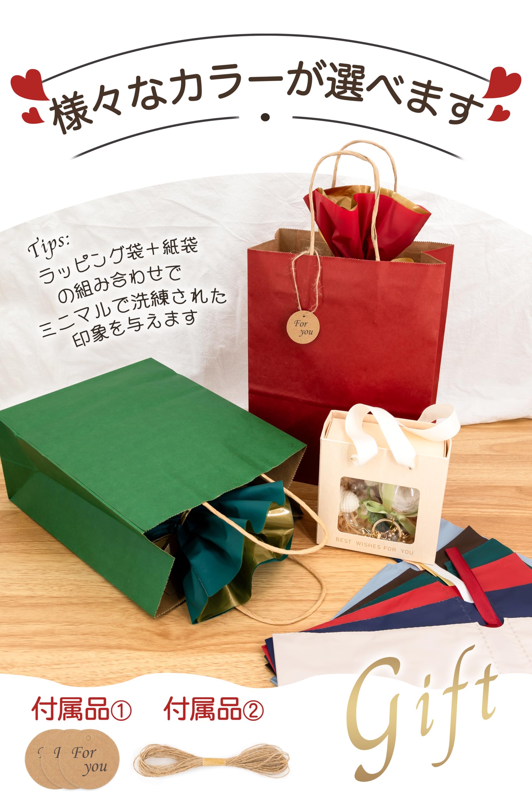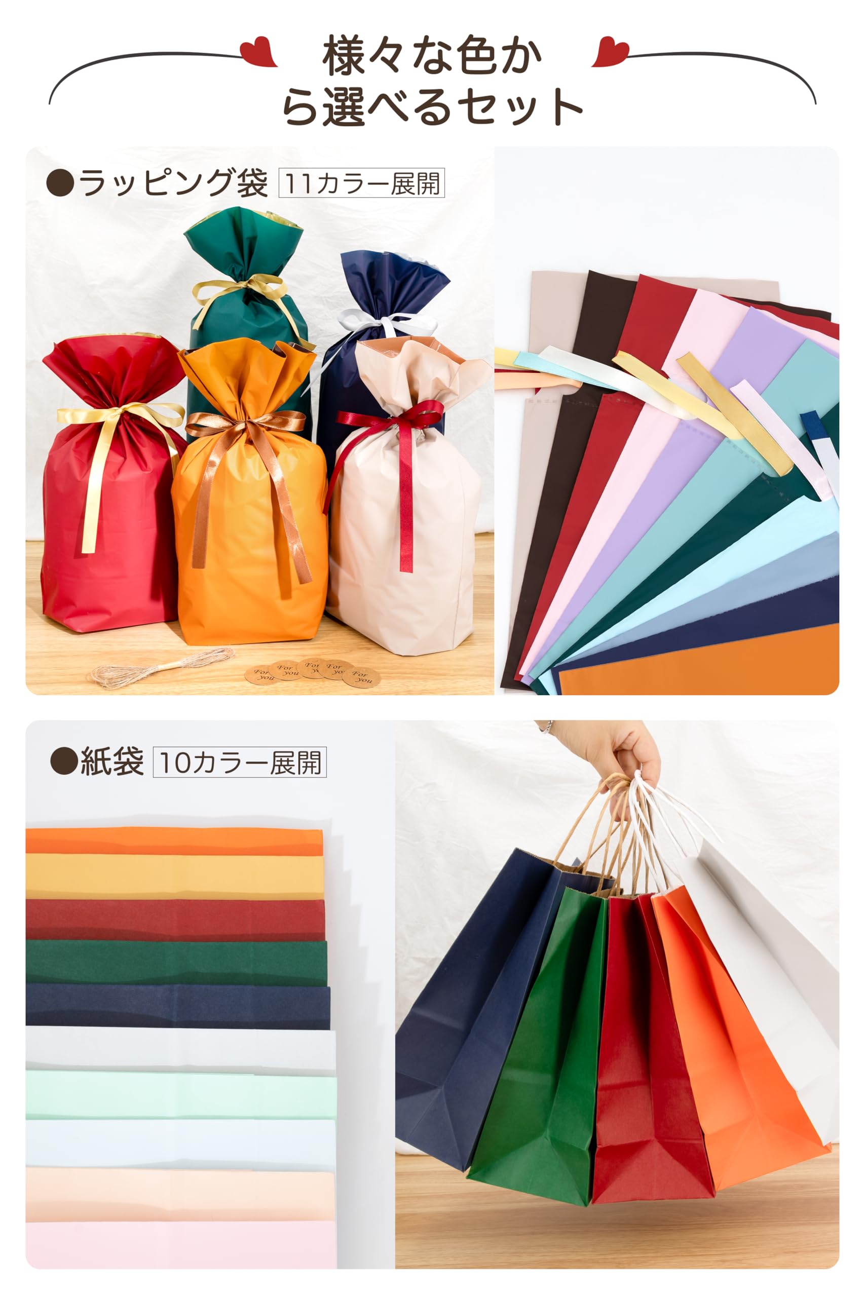 【セット内容】セットをご用意しております。Lセット:3枚ラッピング袋(3色):高さ31*幅43㎝、3枚紙袋(3色):26*12*33cm。Mセット:5枚ラッピング袋(5色):高さ24*幅36㎝、5枚紙袋(5色): 21*11*27cm。Sセット:6枚ラッピング袋(6色):高さ17*幅28㎝、6枚紙袋(6色): 15*8*21cm。S+M+Lセット:1枚Lサイズ(ラッピング袋+紙袋:1色)、1枚Mサイズ(ラッピング袋+紙袋:1色)、1枚Sサイズ(ラッピング袋+紙袋:1色)