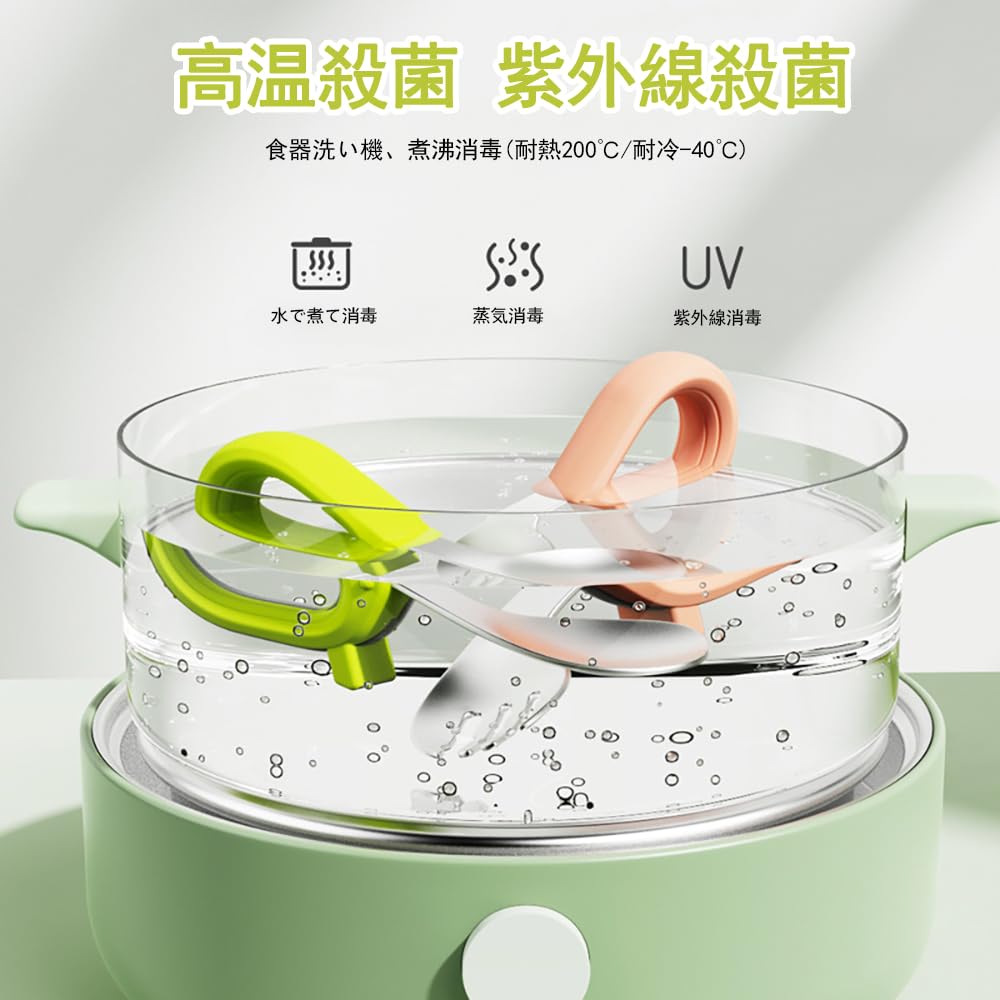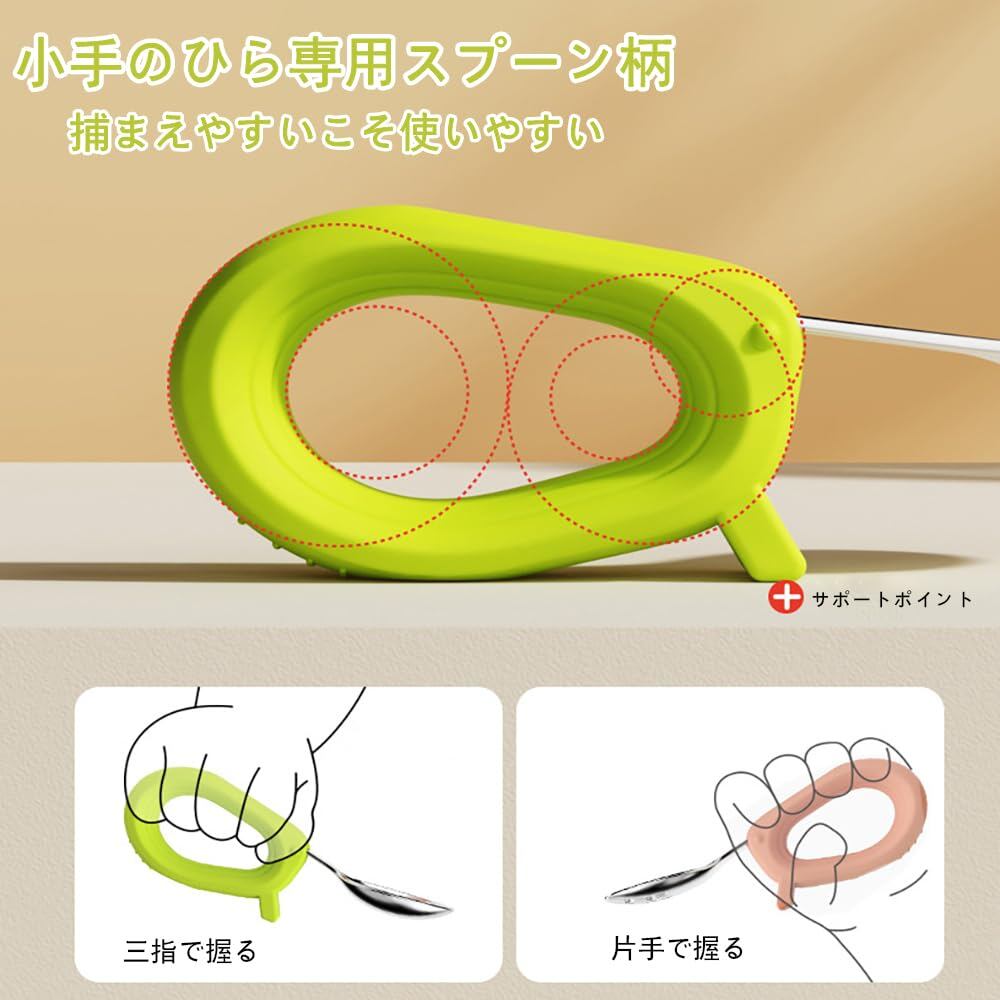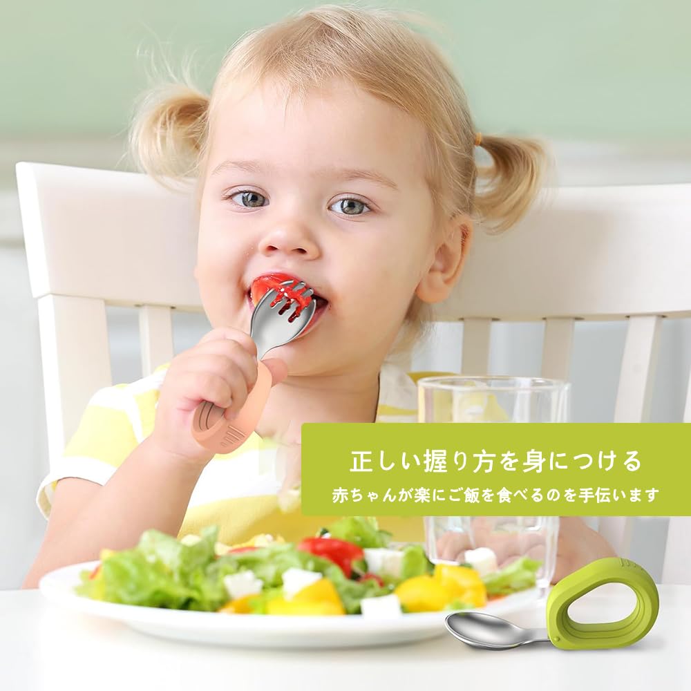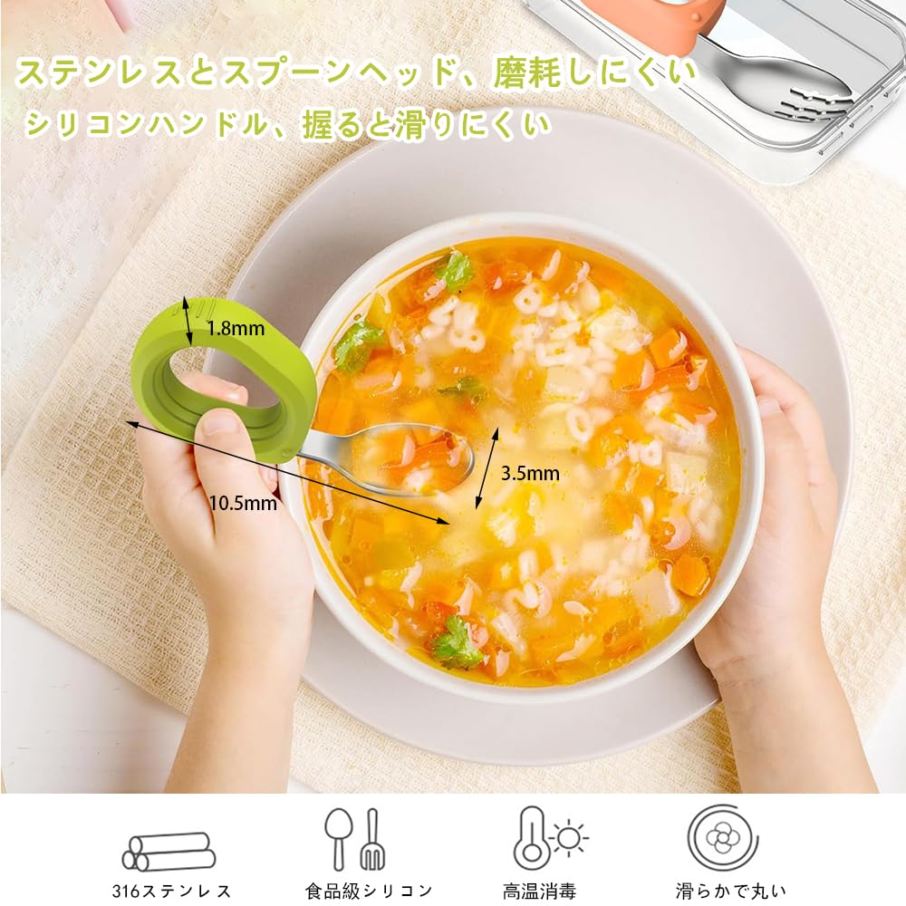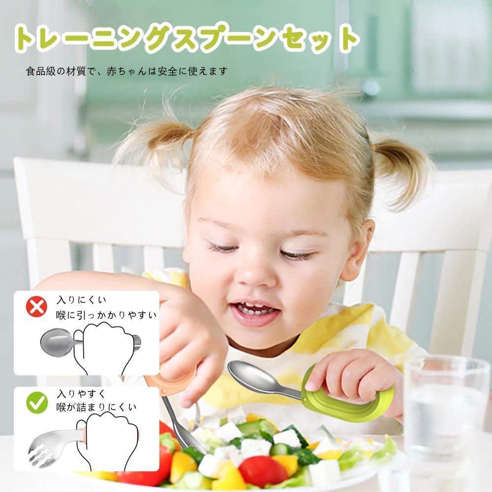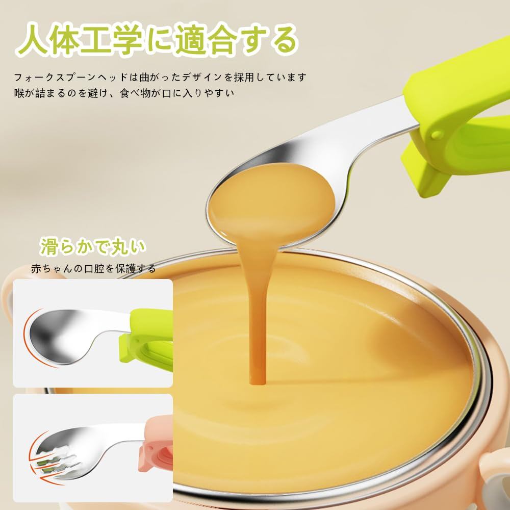 スプーン:10.5mm*3.5mm、フォーク:10.5mm*3.5mm、材料:ステンレス316+食品級シリコン材料、セット内容:グリーンスプーン*1、ピンクフォーク*1、年齢:6ヶ月以上適用。