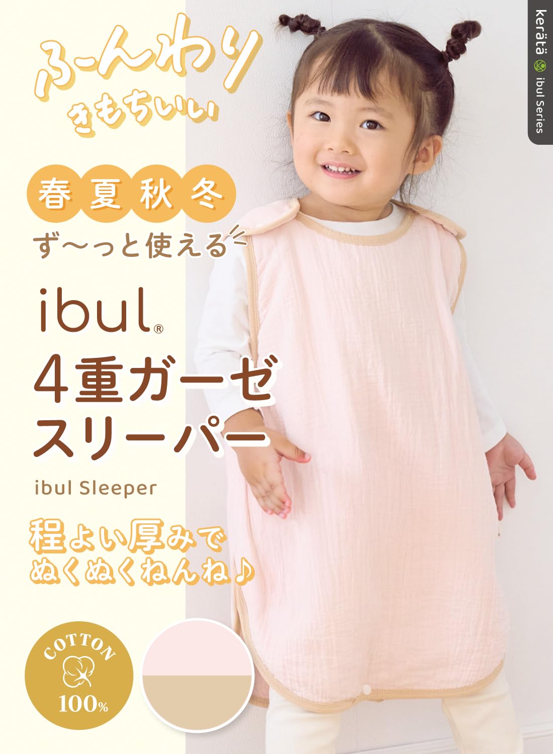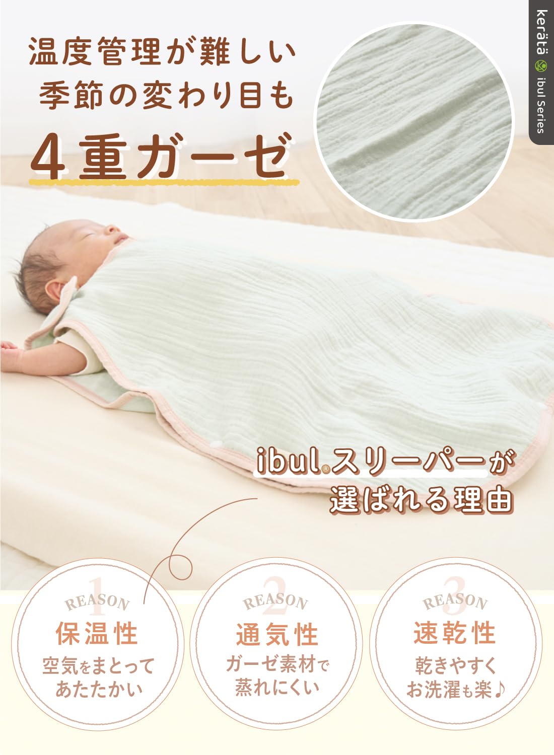 【4重ガーゼスリーパーに新色が登場】イブルスリーパーの4重ガーゼタイプに、3つのパステルカラーが仲間入り! 薄すぎず、厚すぎない4重ガーゼは、ほど良い厚みで1年を通して快適なねんねをサポートします。